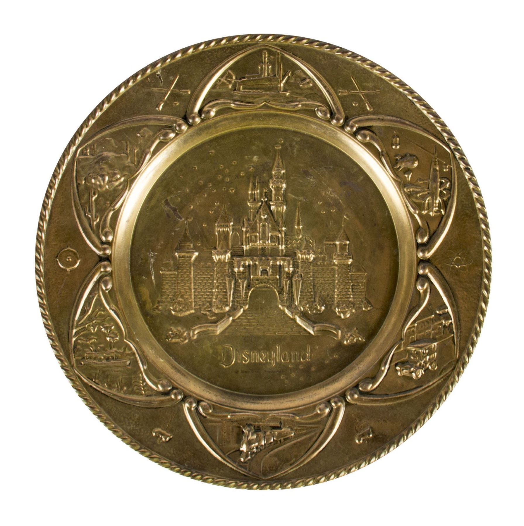 (Disneyland, 1960s) A brass platter featuring the different attractions of the park. This platter measures 12.25" in diameter and is in good condition with some spots of wear on the surface.
