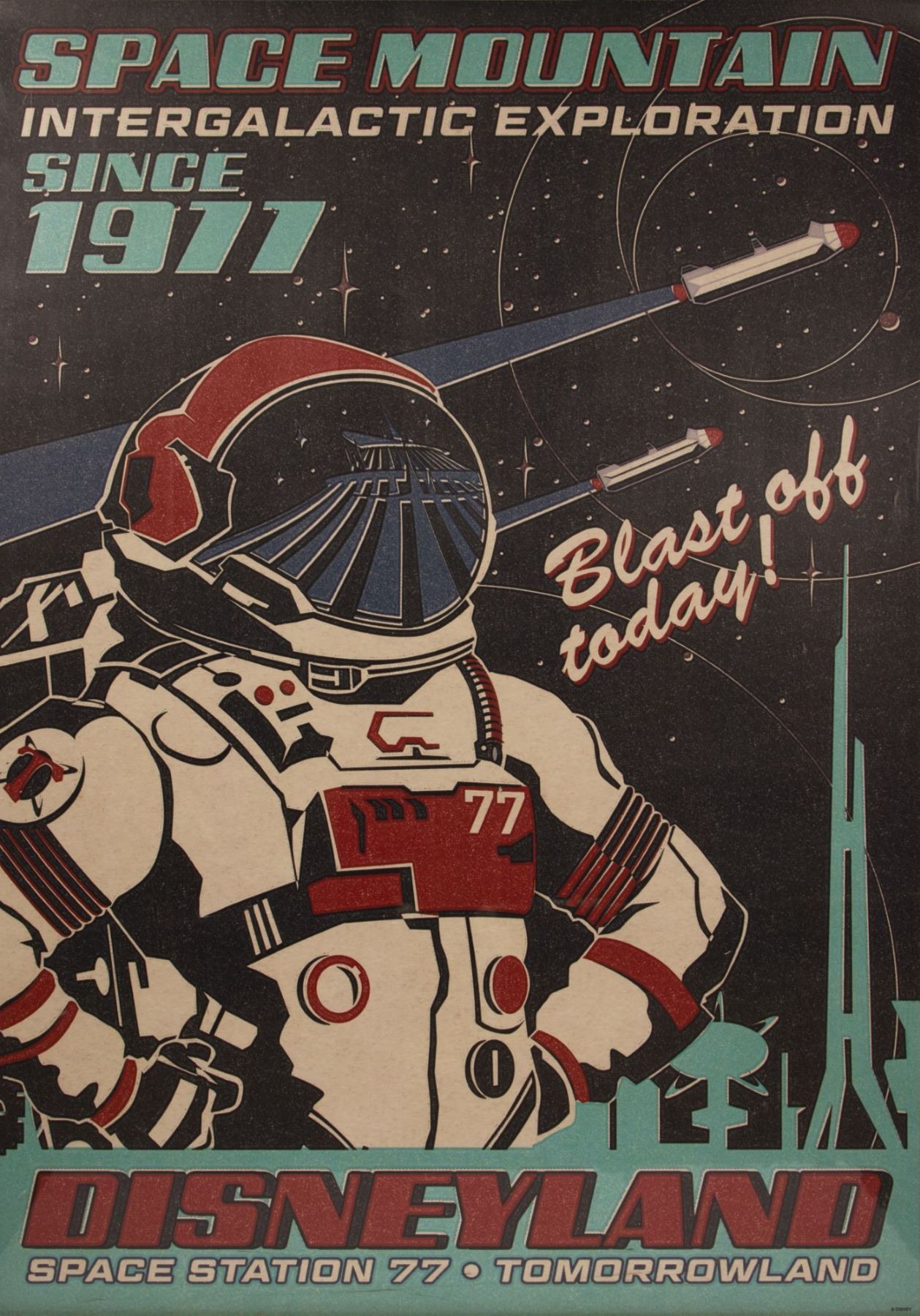 (Disneyland, 2017) A fantastic poster sold at the D23 Expo celebrating the 40th anniversary of the Space Mountain attraction. This poster features an astronaut with the iconic Space Mountain building reflected on his visor. Measuring 54"x36", the poster is in very good condition with minor edge-wear along the left side.