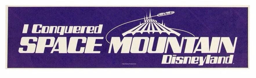 (Disneyland, 1977) A rare cast member bumper sticker from the opening of the "Space Mountain" attraction at Disneyland. The sticker reads "I Conquered Space Mountain - Disneyland" in white text over a blue backing. This item measures 3.75"x14" and is in very good unused condition with little wear.