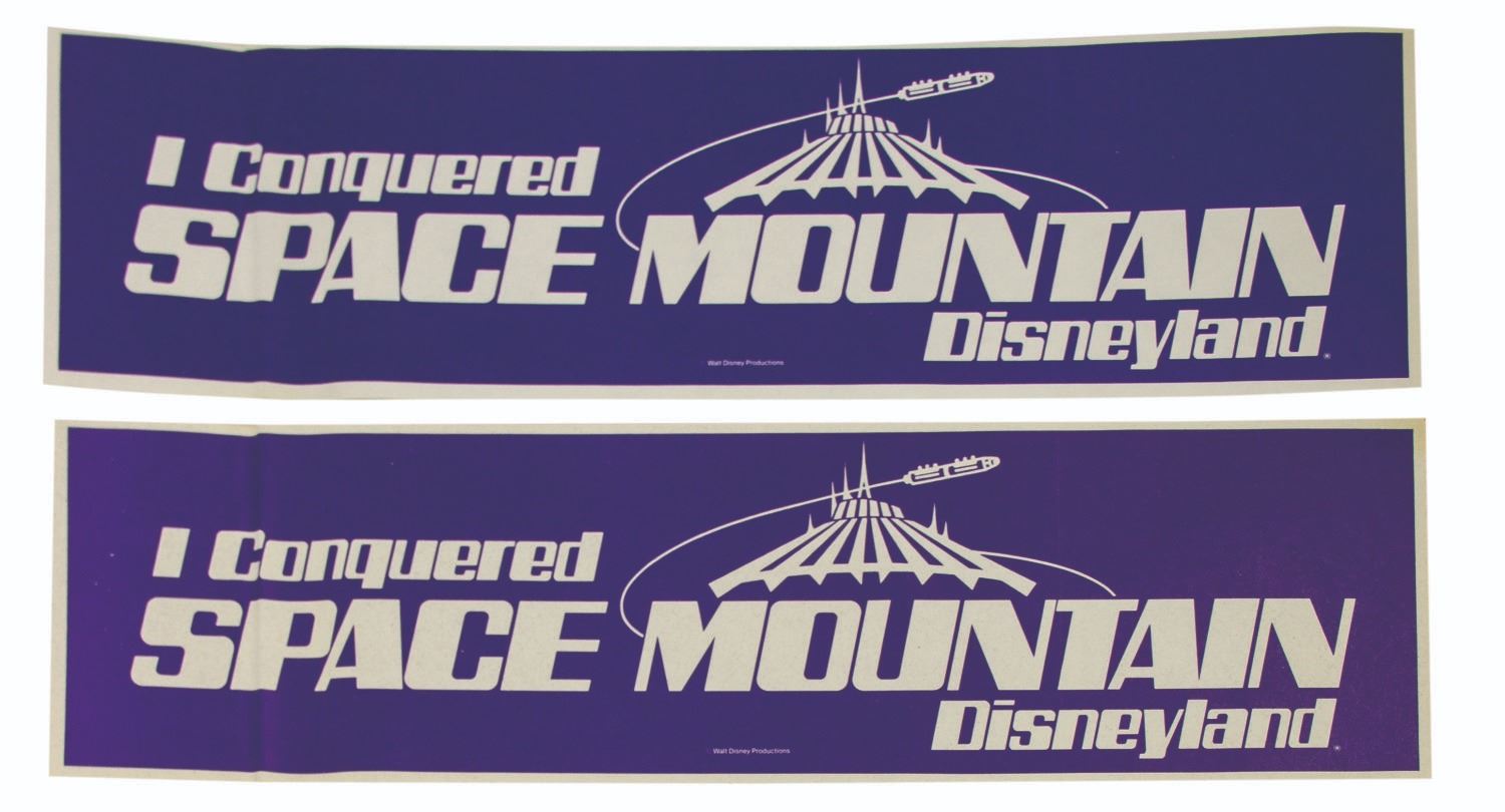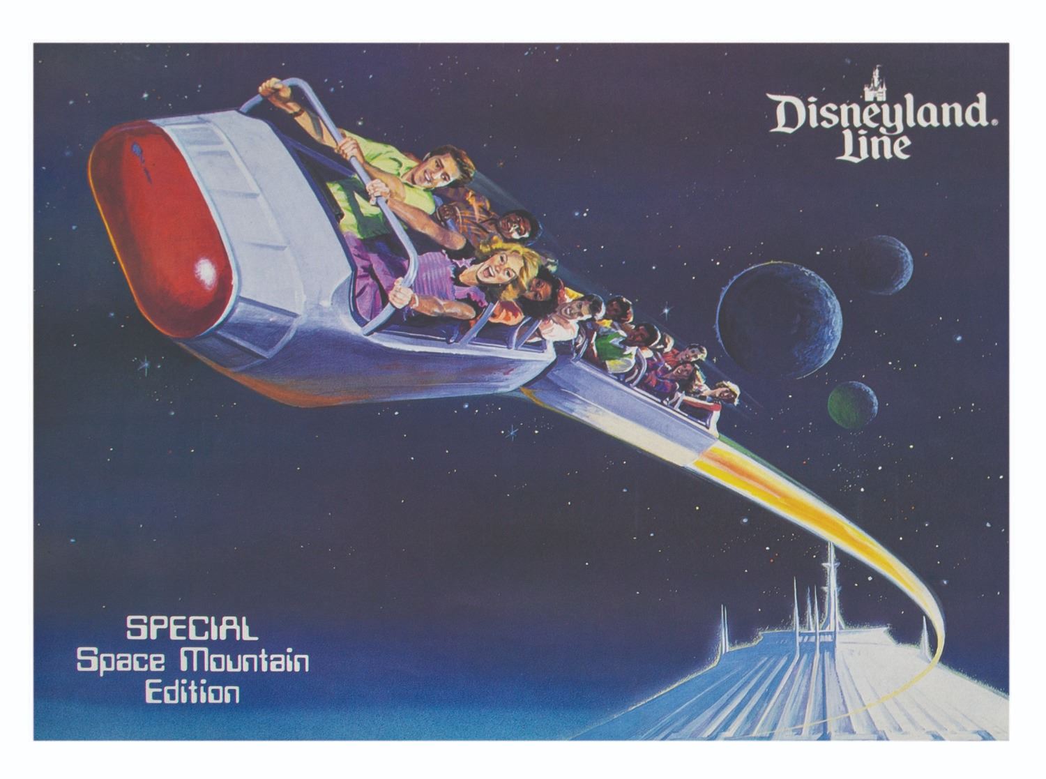 (Disneyland, 1977) A cast member packet for the premiere of Space Mountain. The outer folder contains a special Space Mountain edition of Disneyland Line magazine, two unused bumper stickers, a cast premiere button, and two numbered cast member tickets to the attraction's premiere event. The outer folder measures 12"x9" and its contents are in good condition with some creases and surface wear.