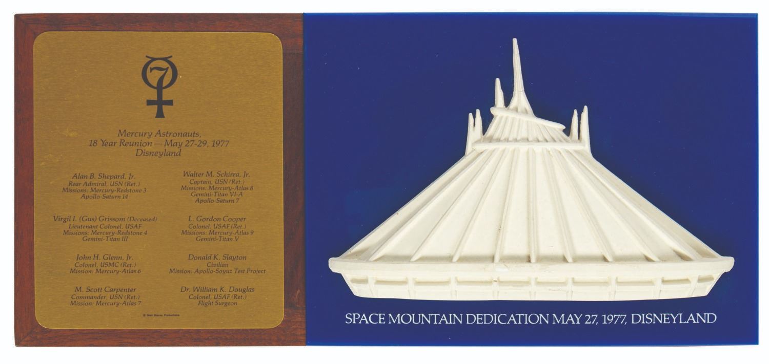 (Disneyland, 1977) A very rare commemorative plaque created for the Mercury Astronauts 18-year reunion event at Disneyland as part of the Grand Opening weekend for Space Mountain. The event was held between May 27-29, 1977, and this seldom-seen gift features a metal plaque with the names of eight Mercury Astronauts, six of whom attended the opening, as well as a dimensional recreation of the Space Mountain attraction building. This rare gift measures 6.25"x13.75" and 1.5" deep and is in very good overall condition with a few small nicks and scuffs to the attraction building. There is a small crack in the base of the top spire on the building.