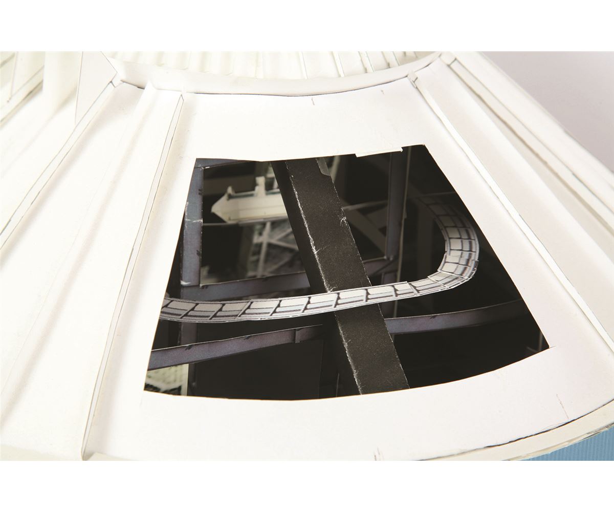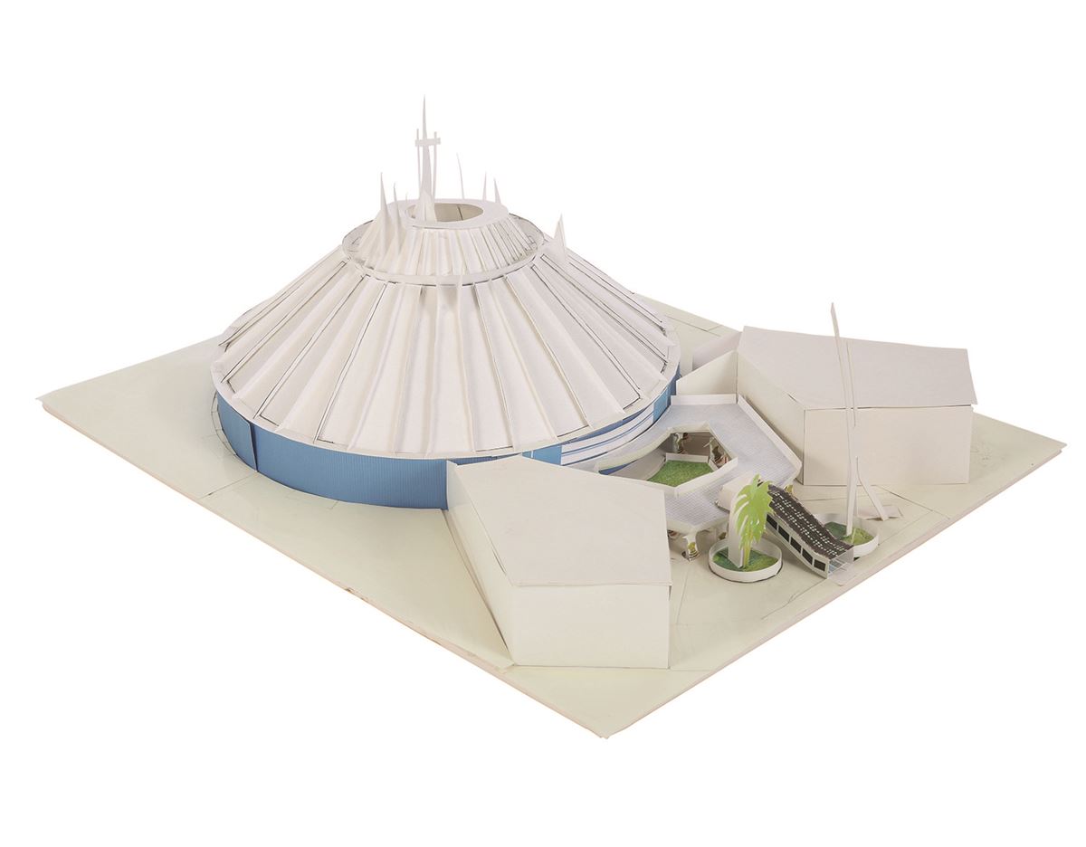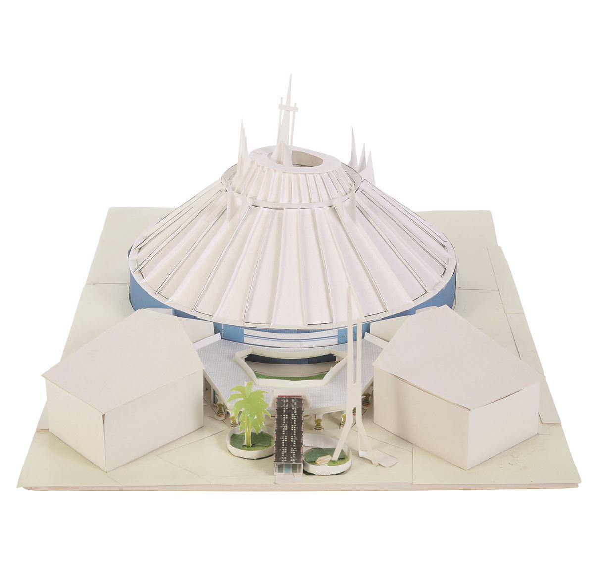 (Disneyland, 1992) Incredible paper model of Disneyland's Space Mountain. Artist Ty Ervin was commissioned by the studio in 1992 to build this model for promotional purposes. Constructed of paper and board, the model has incredible detail on both the exterior and interior of the attraction. Housed in a custom Plexiglas box . Model measures 17"x20"x8.5". Entire presentation measures 20.25"x30.25"x10.75".