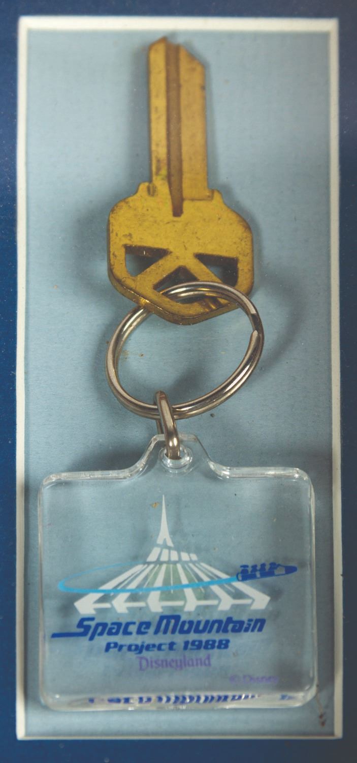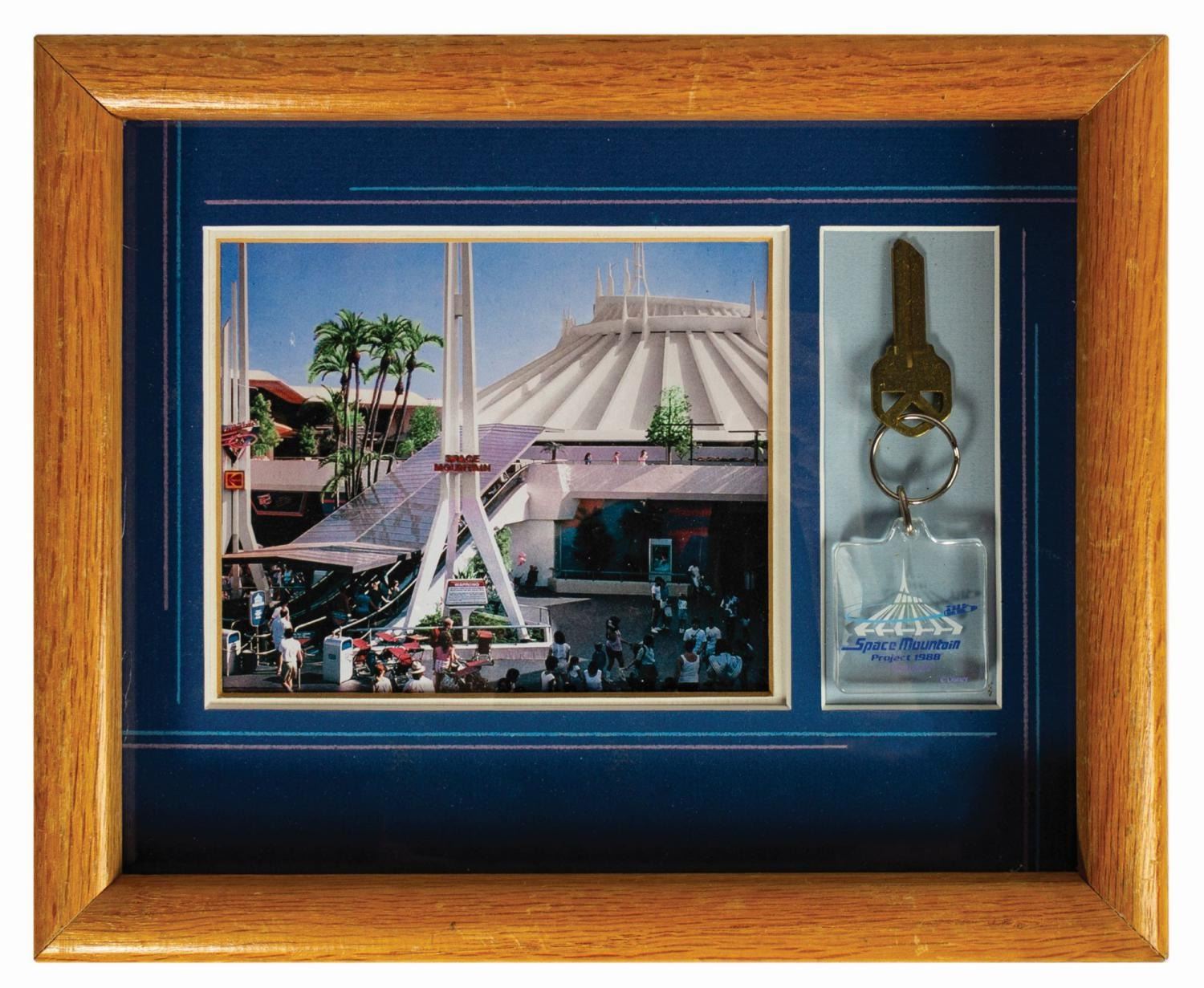 (Disneyland, 1988) A team key and fob from a 1988 Space Mountain refurbishment project at Disneyland. The key is uncut, and the fob features the classic Space Mountain logo and reads "Project 1988." Given only to team members who worked on the project, the key and fob have been custom mounted and framed. Measuring 4.75"x1.5" in its 9.25"x11.25" frame, the condition is very good with minor wear.