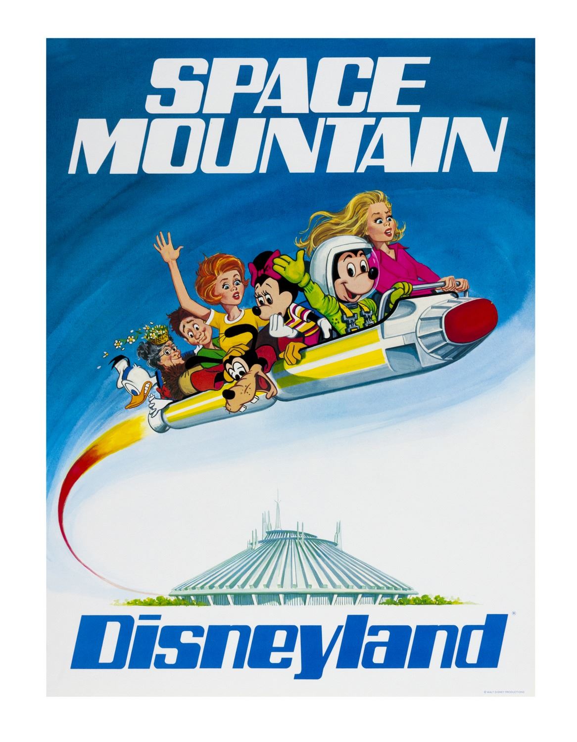 (Disneyland, 1977) A scarce promotional poster for "Space Mountain" at Disneyland. This poster was created to promote the attraction during its opening year, and features a mix of Disney animated characters and characters from live action Disney properties such as "Freaky Friday", which also debuted that year. The poster measures 24"x18" and is in very good condition.