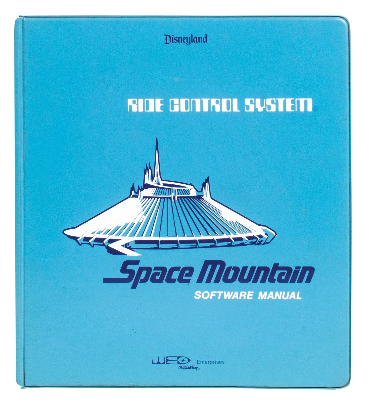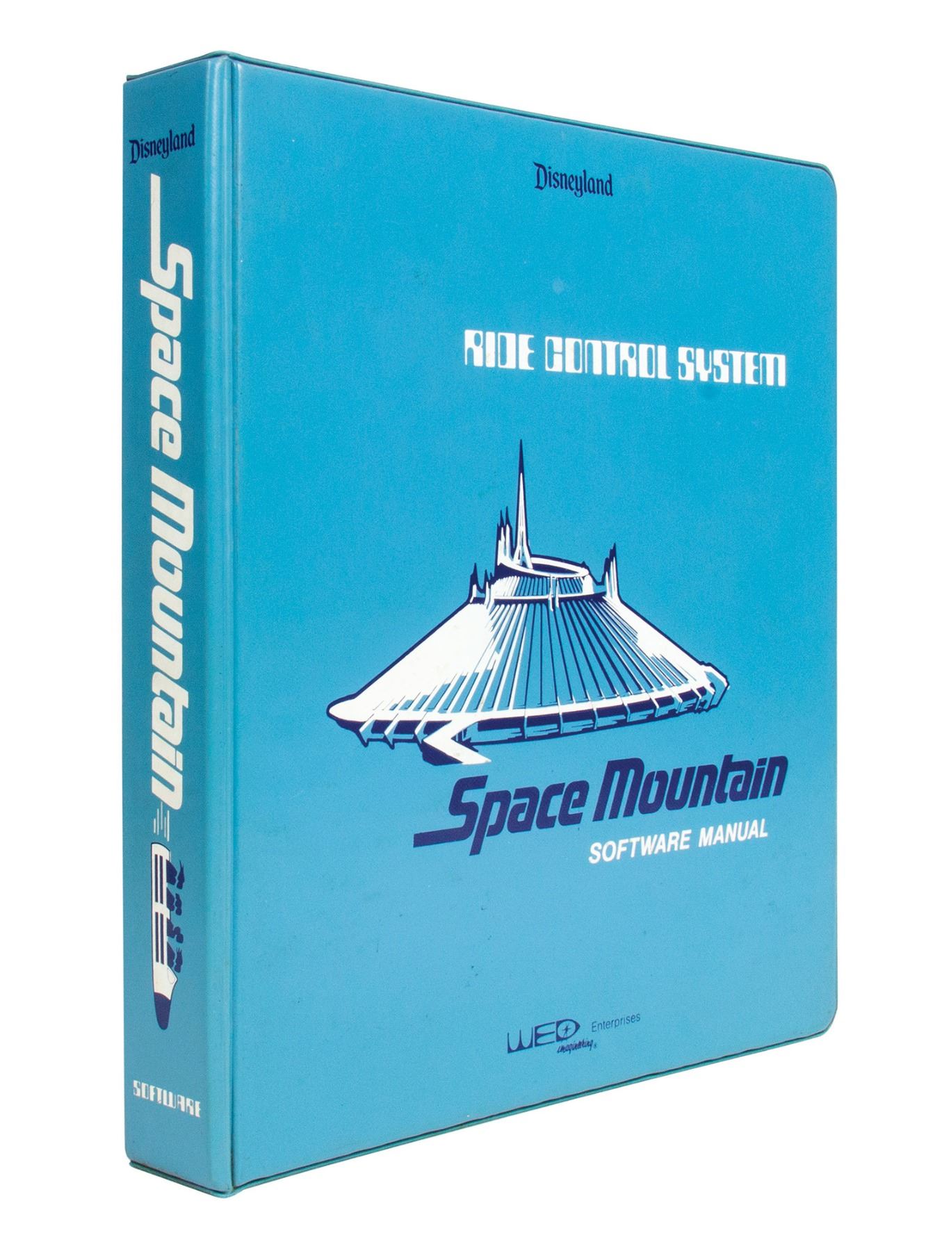 (Disneyland, c.1980s-90s) A stylish binder created by WED Imagineering to house the software manual for Disneyland's "Space Mountain" attraction. This binder does not contain any documents, however it features a beautiful logo on the cover of "Space Mountain" and the WED logo. The blue binder measures 11.5"x10.5" and 1.5" thick, and is in fair to good condition with some surface wear and a few small spots of discoloration from use.