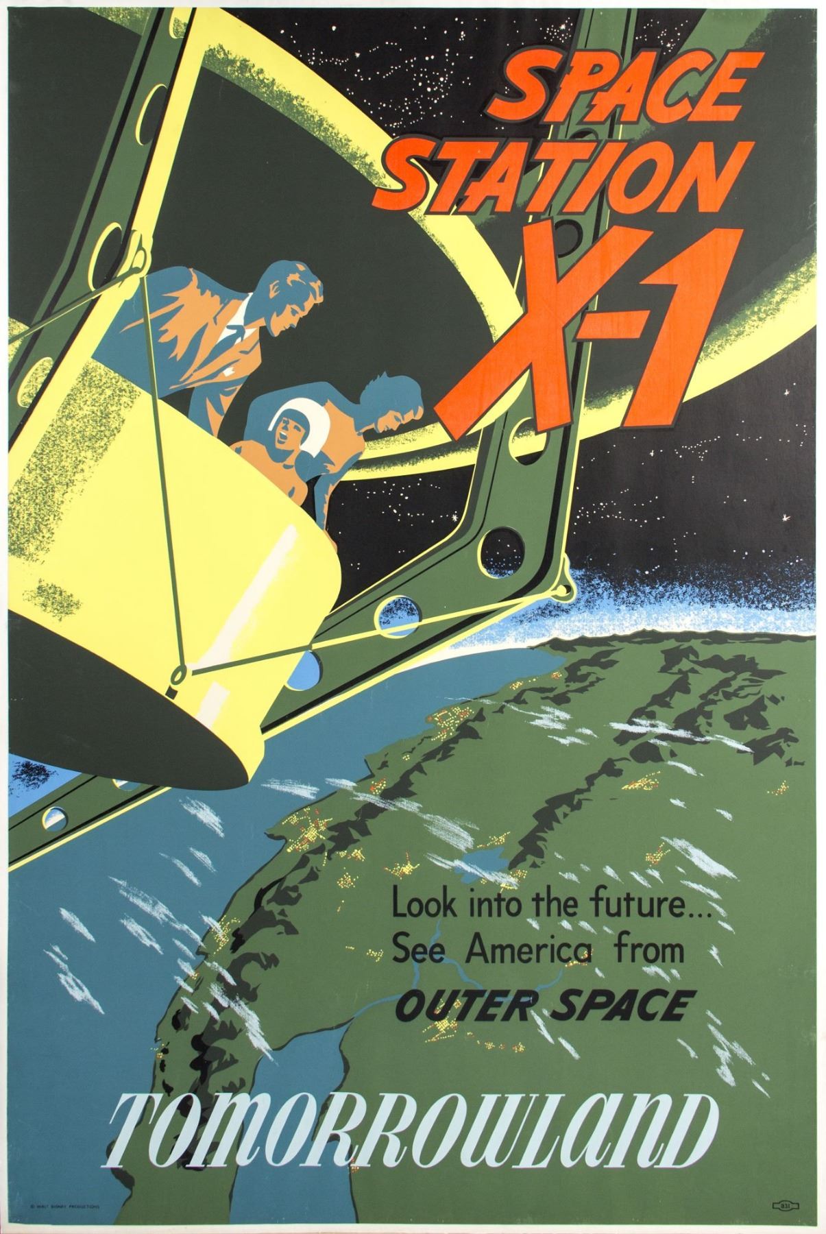 (Disneyland, 1956) A hand-silkscreened poster for the "Space Station X-1" attraction. This walk-through attraction opened in 1955 and gave guests the experience of traveling through space. In 1960, the attraction was replaced with the "Art of Animation" exhibit. Designed by Bjorn Aronson, this 54"x36" poster is linen-backed to a size of 54.75"x37". This item is in very good condition with some surface wear and minor creasing throughout.