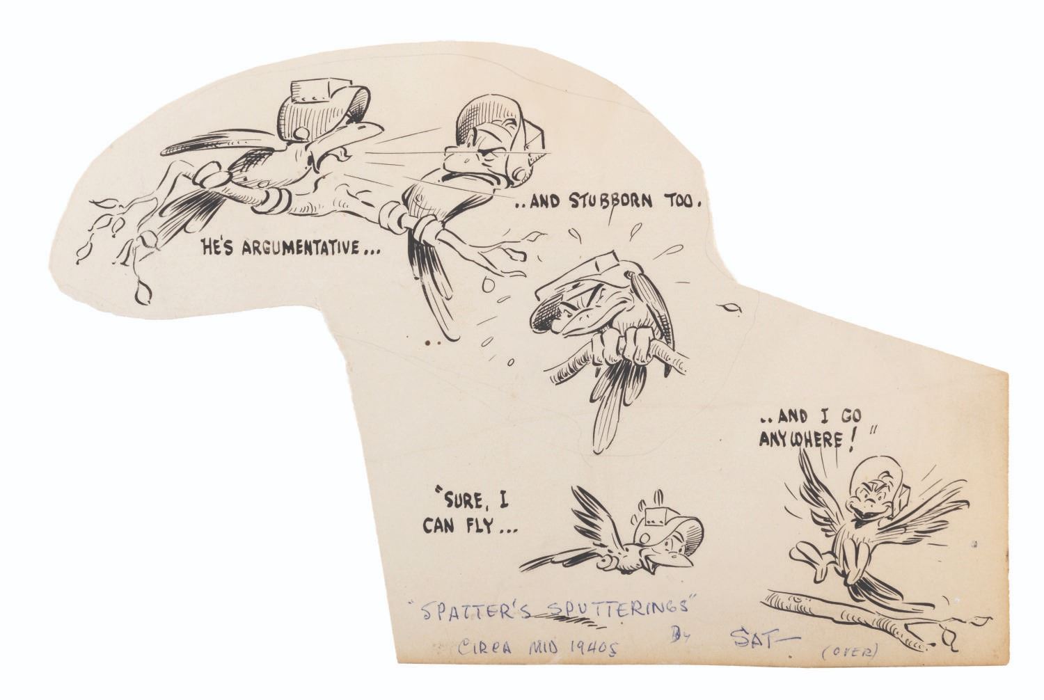 (Sat, 1940s) Five original inked drawings of welder birds by cartoonist "Sat." A note on the back explains these were drawn for a series on welding pitched to General Electric in the 1940s. Measuring 9.5" x 6", the drawings are in very good condition, with discoloration and wear to the paper.