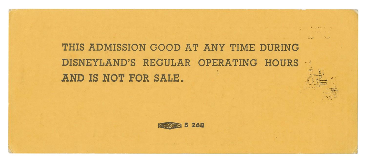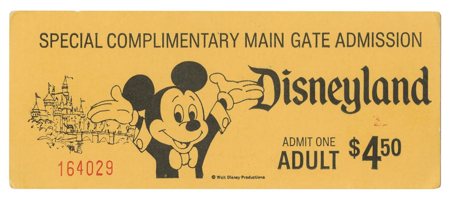(Disneyland, c.1975) An unused Special Complimentary Main Gate Admission ticket to Disneyland that is still valid for park admission today. This particular ticket belonged to Disney Legend Milt Albright and is numbered 164029. Measuring approximately 2"x5", the ticket is in very good condition with minor wear.