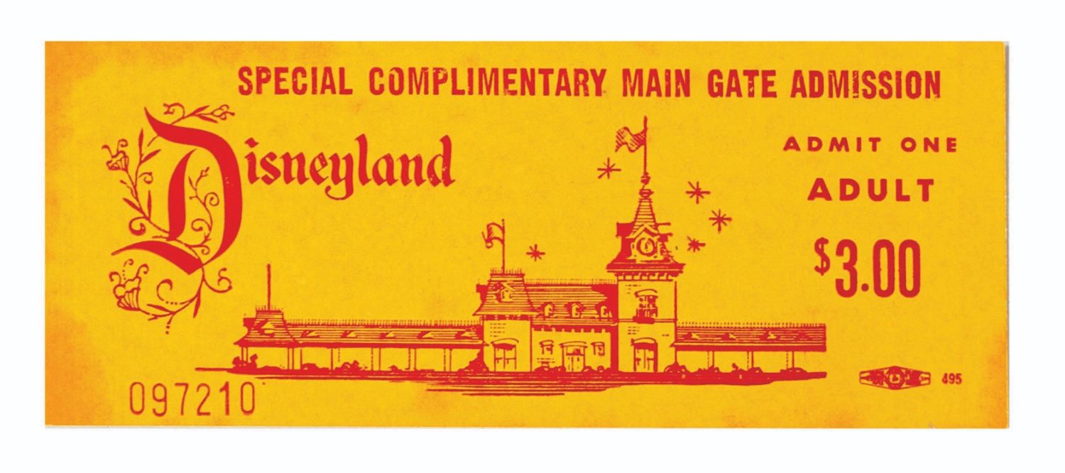 (Disneyland, c.1960s) A vintage Disneyland Special Complimentary Adult Main Gate Admission ticket from the collection of Disney Legend Milt Albright, who founded the Magic Kingdom Club program. The yellow-gold ticket bears a face value of $3.00 and is numbered "097210." Never used, this ticket is still valid for park admission today. Measuring 2"x5", the ticket is in fair condition with some spot discoloration to the reverse and darkening around the edges.