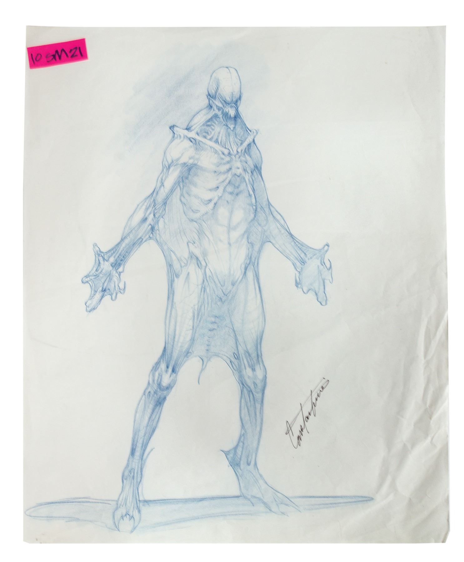 (Columbia, c.2006) An original concept design by Constantine Sekeris for the character Venom, to be used in Spider-Man 3. Accomplished in blue pencil on thin art paper, the design depicts a much more grotesque, alien-like Venom than what was ultimately used in the film. The drawing originally came from the collection of special effects artist Steve Johnson, and a COA is included from Johnson. The drawing is signed by Sekeris in ink and measures 17"x14". The condition is fair to good with some creasing to the paper from use.