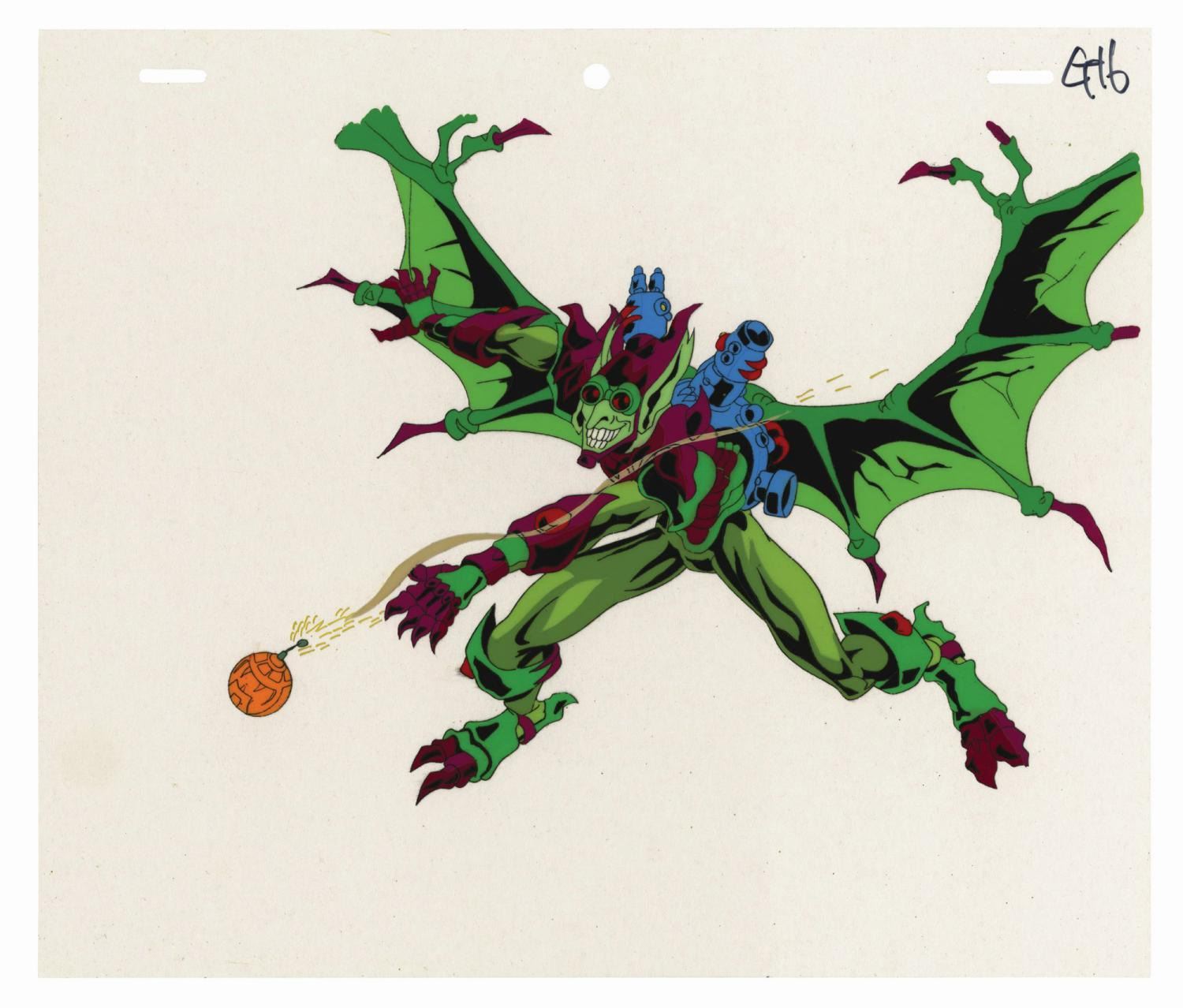 (Marvel, c.1999) An original hand-painted production cel from Spider-Man Unlimited. The cel depicts the fan favorite Green Goblin, who in this animated series becomes a hero as opposed to a villain. The cel depicts a fantastic action pose of the Green Goblin throwing one of his trademark pumpkin bombs. The Goblin has a painted image size of 6.75"x8.75" on the 9"x10.5" cel sheet. The cel is in very fine condition.