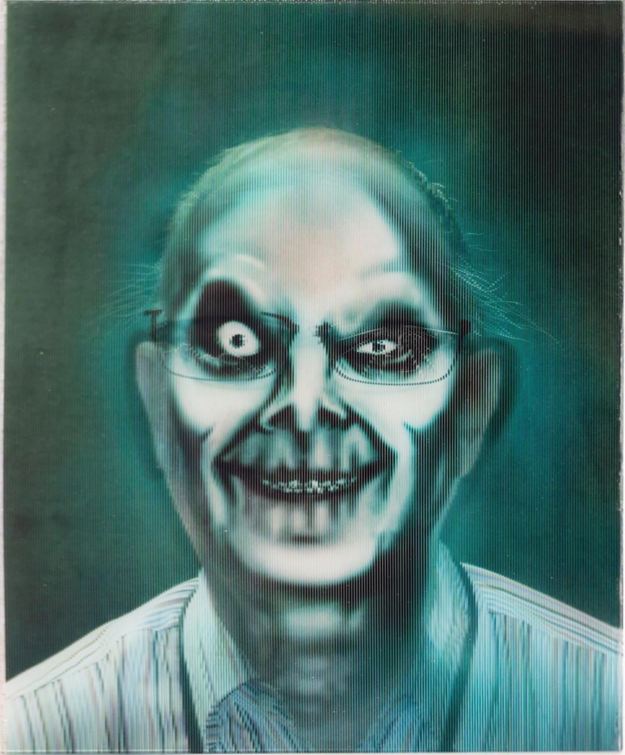 (Walt Disney World, c.2000s) A test Spirit Photography transforming lenticular portrait created by Imagineering to demonstrate the changing portrait effect for use in merchandising. These souvenirs would later be available from the Memento Mori giftshop in Liberty Square. Guests could have their photo taken with a special camera disguised to look like an antique daguerreotype, and a lenticular print would be made that transformed the sitter into a ghastly ghoul. The test print measures 10"x8" and is in fine condition with minimal wear.