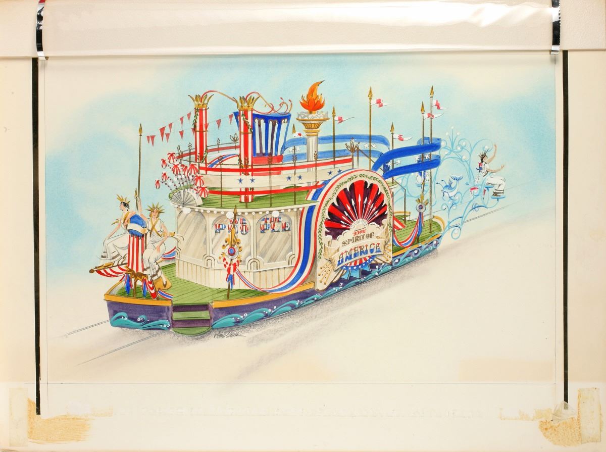 (Disneyland/Walt Disney World, 1970s) Beautiful original float design by Imagineer Wes Cook. Known for his imaginative costume and parade designs during the 1960s and 1970s, this design by Cook could have been for either WDW or Disneyland. Accomplished in gouache and colored pencil on 18"x24" artist's board. In good condition with some staining to board and mat. Signed by the artist at bottom left of image.