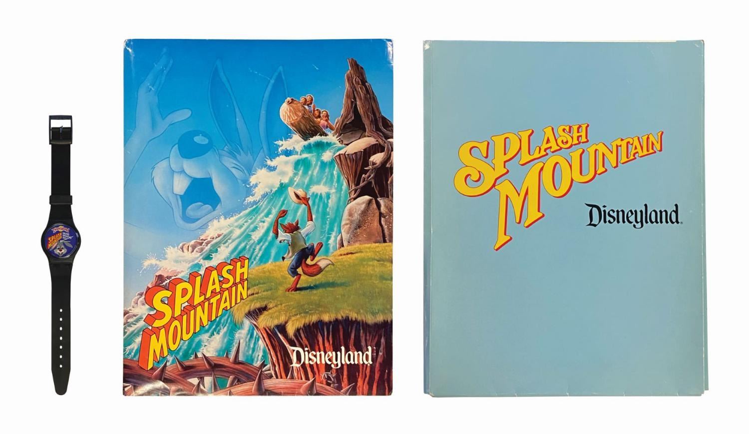 (Disneyland, 1988-89) A collection of press materials relating to the opening of Splash Mountain at Disneyland. The collection includes a pre-opening folder with (2) press photos and (3) sheets of press release information, and a grand opening folder containing (8) press photos and (6) press releases. Also included is a Splash Mountain grand opening press watch. The outer folders measure 12"x9" and the watch band measures 9" long. The collection is in very good condition overall with some creasing and handling wear to the folders from use. The watch is unused and likely requires a new battery.