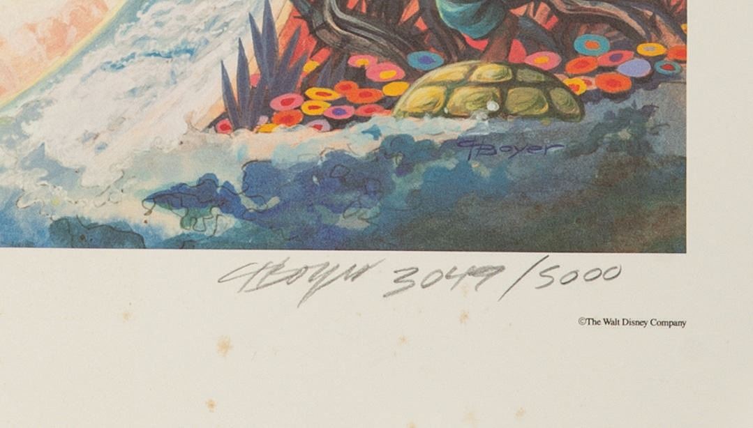 (Disneyland, 1989) A limited edition signed lithographic print by Charles Boyer, created to commemorate the opening of Splash Mountain at Disneyland. The lithographic print is titled "The Laffin' Place" and is signed by Boyer in the bottom-right corner. Measuring 30"x24", the lithograph numbered 3,049/5,000 displays in fair condition with some wear along the margins, including scattered spots of discoloration.