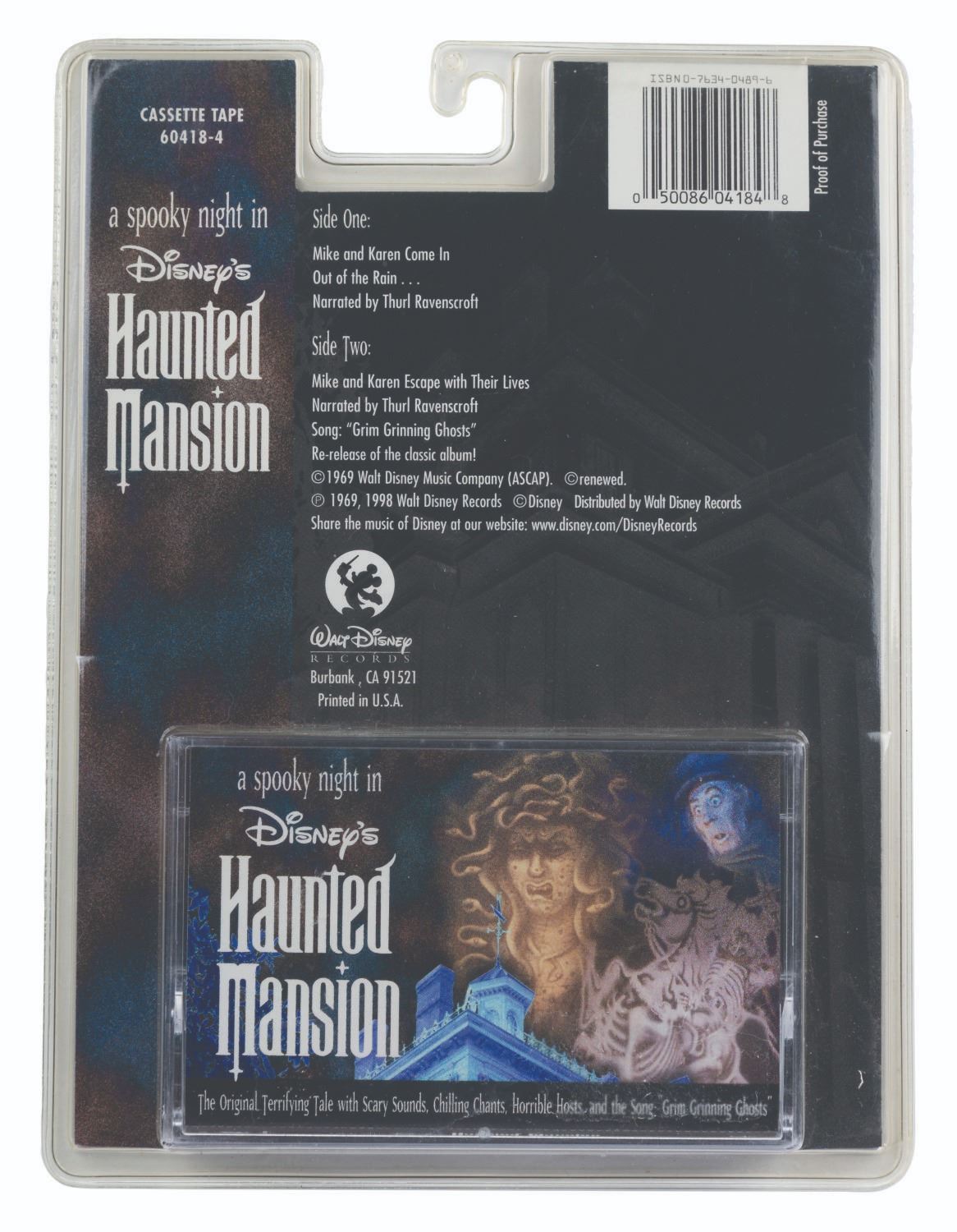 (Walt Disney Records, 1998) A Spooky Night in Disney’s Haunted Mansion Cassette Tape. The cassette tape contains a unique audio tale with “scary sounds, chilling chants, Horrible Hosts,” narrated by the Legendary Thurl Ravenscroft with The Grim Grinning Ghosts song. The tape is in fine condition sealed in its original package.