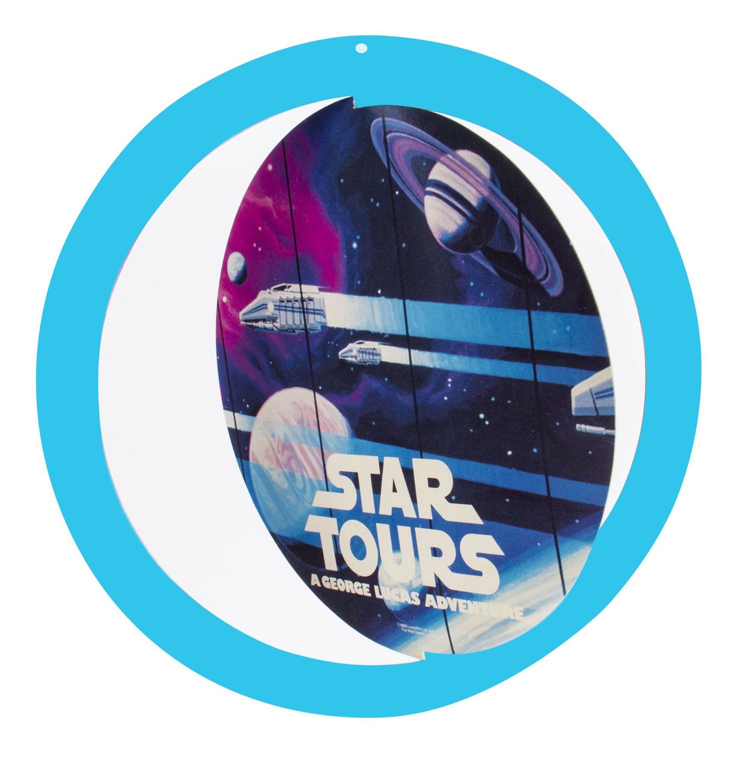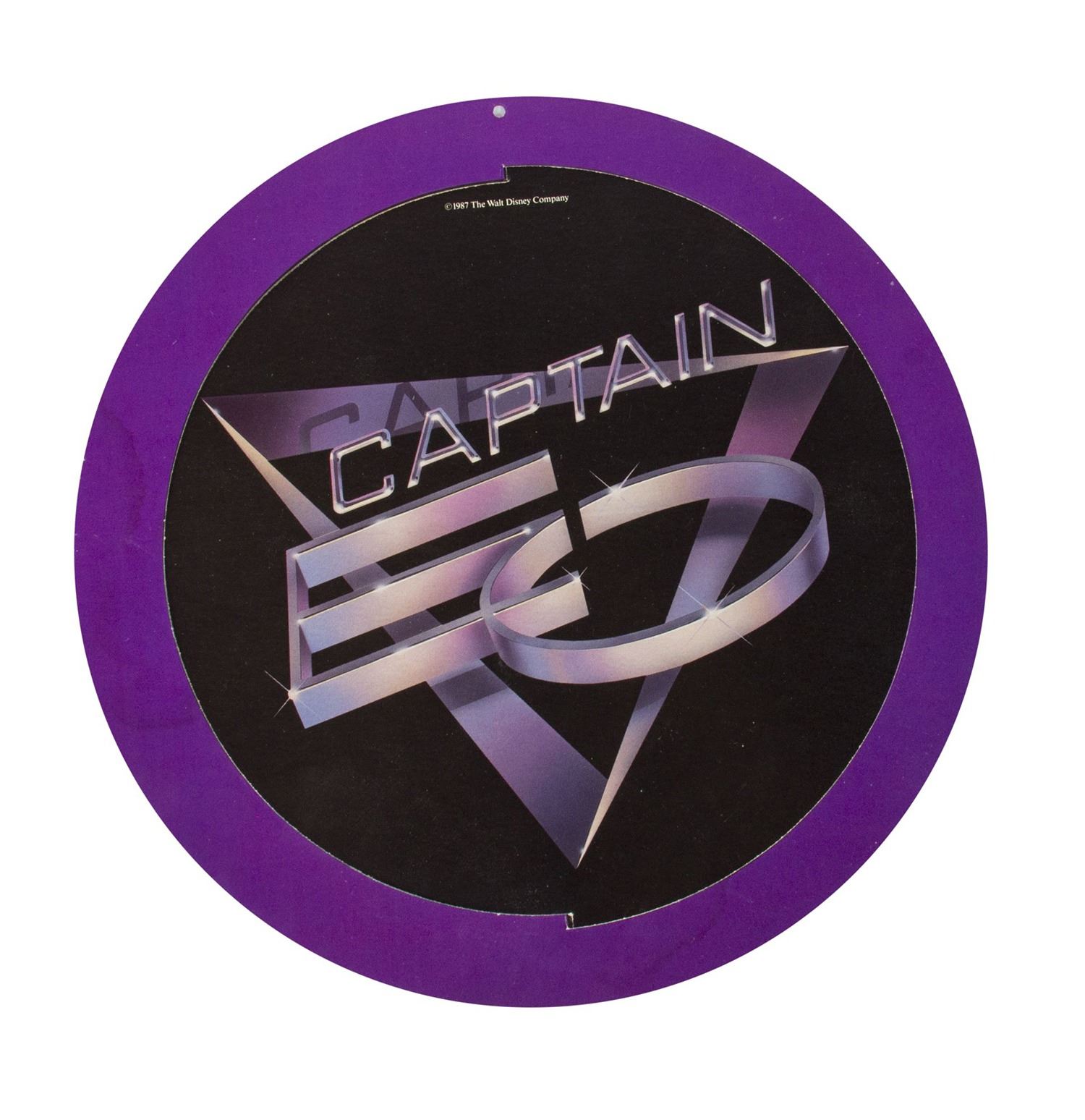 (Disneyland, 1987) A double-sided hanging promotional sign for the Star Tours and Captain EO attractions at the Disney Parks. This paper sign is created so that the center imagery can rotate slightly from its border. The sign measures 10" in diameter and is in fair to good condition with some edge-wear and slight curving to the board from use.