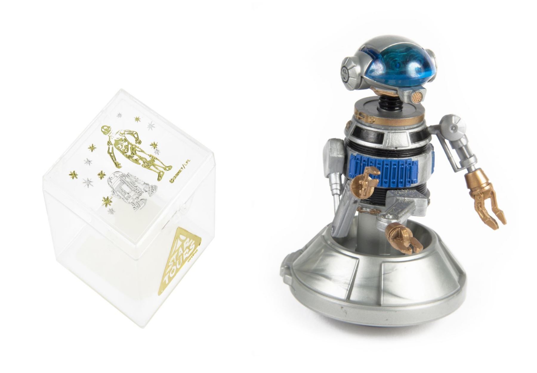 (Disneyland, c.1990s-2000s) A souvenir toy of Captain RX-24 (Rex) from Disneyland's "Star Tours" attraction, paired with a plastic "Star Tours" box. The toy features several rotating sections so that each arm can be moved independently, as well as the head and body. Rex's blue visor cal also be lifted. The box features C3PO & R2D2 on the lid with the "Star Tours" logo on the front side. The toy measures 3.5" tall and the box measures 2.75"x2.75" and 2.25" tall. The condition is very good throughout with minor wear from use.