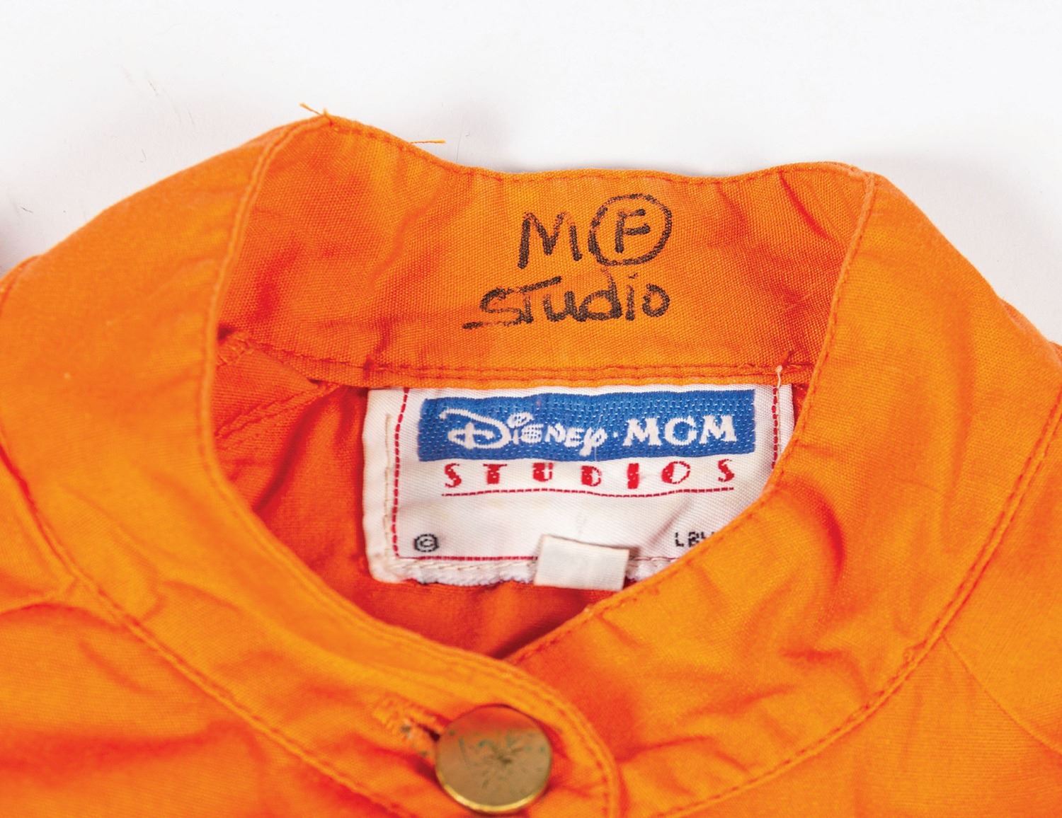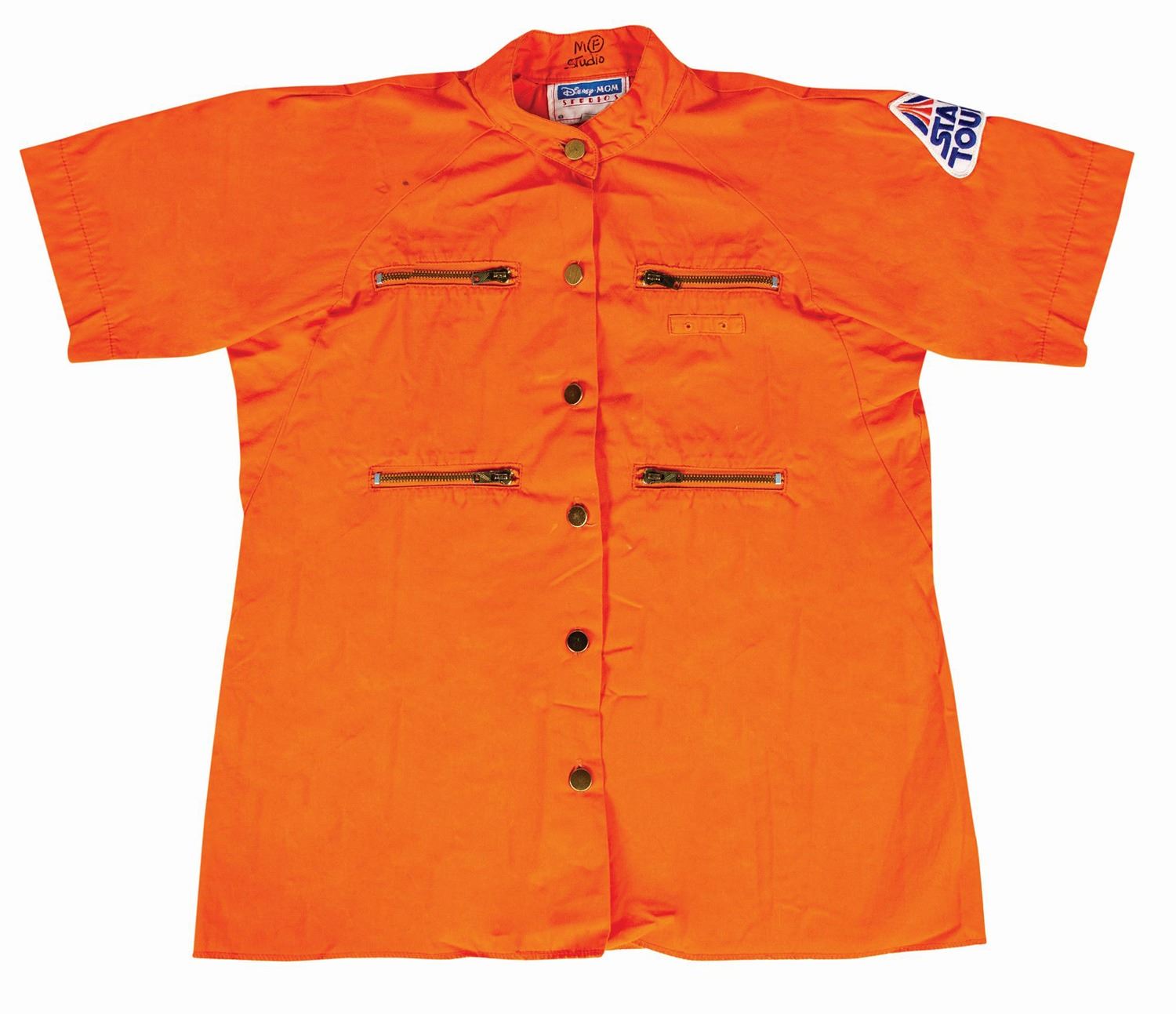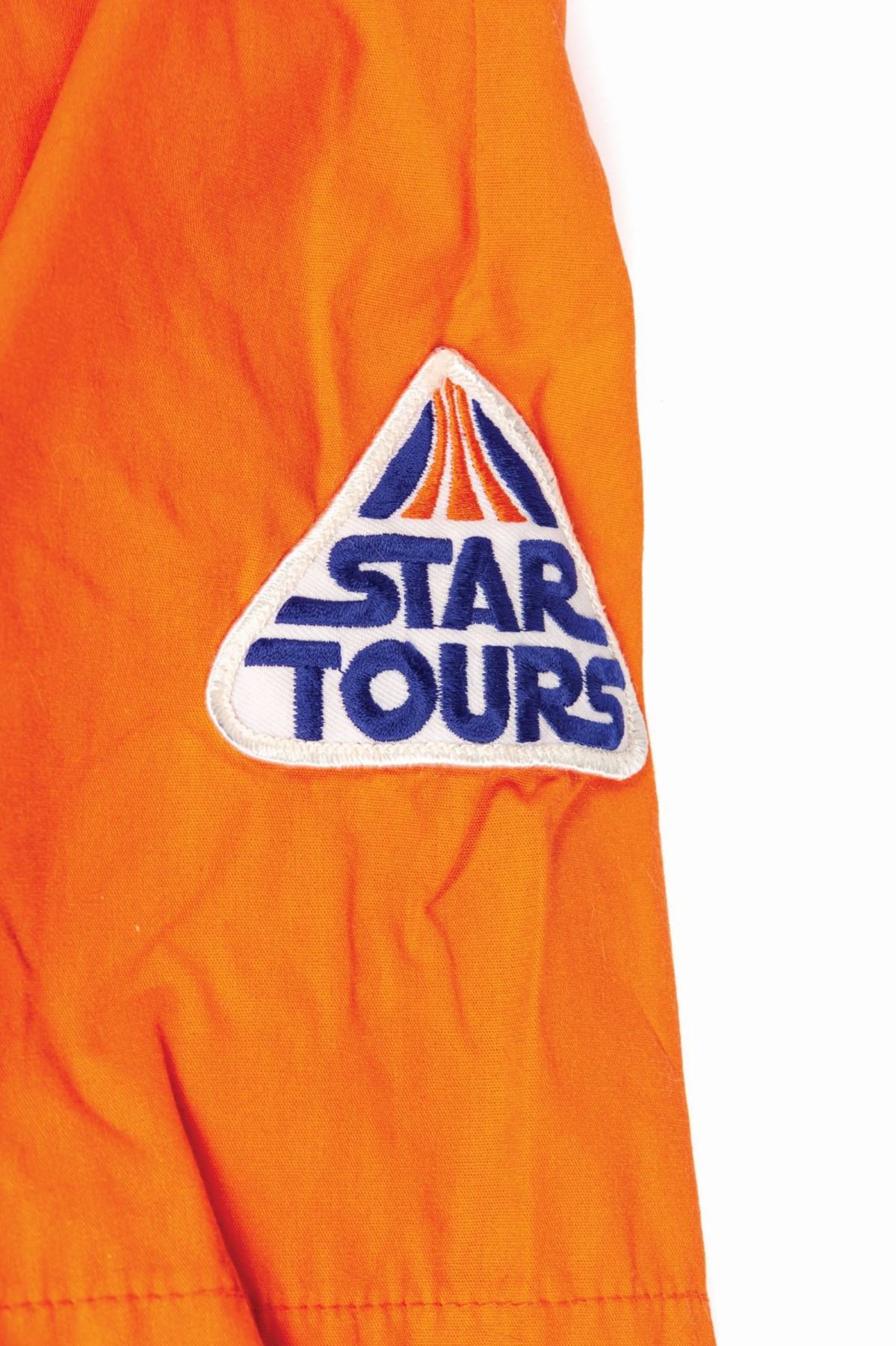 (Disney-MGM, c.1990s) An original female cast member shirt from the Star Tours attraction at Disney-MGM Studios. A size M, the shirt retains a Star Tours embroidered patch on the left sleeve, an internal Disney-MGM Studios label, and is marked on the interior of the collar “M(F) Studio.” It is in very good condition, exhibiting a few small spot stains, surface loss to buttons, and general wear from park use.