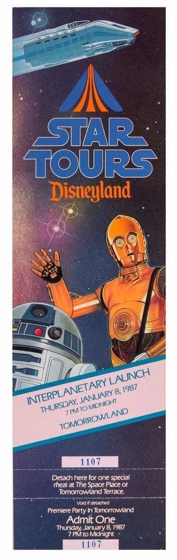 (Disneyland, 1987) A very scarce unused admission "interplanetary launch" ticket for the January 8, 1987 "Star Tours" attraction premiere party at Disneyland. This ticket features R2D2 and C3PO and is numbered 1107. This item measures 12.5"x3.5" and is in very good condition with minor edge-wear and a small spot of discoloration on the back.