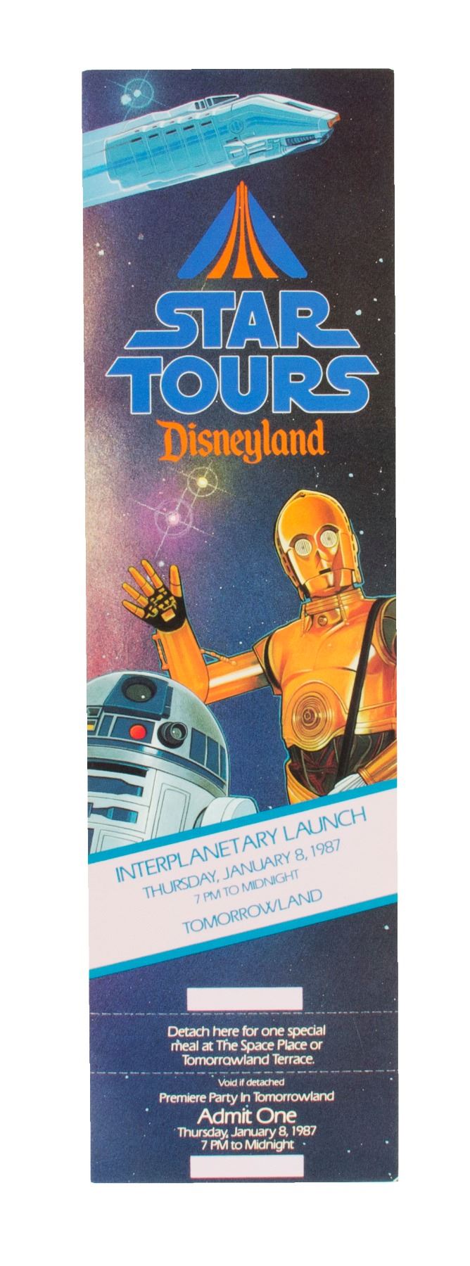 (Disneyland, 1987) A scarce unused admission ticket to the "interplanetary launch" of "Star Tours" at Disneyland on January 8, 1987. The ticket features R2D2 and C3PO and still retains the Premiere Party and Meal Voucher stubs at the bottom. This particular ticket was likely an unused production sample as it is unmarked with a serial number. The ticket measures 12.5"x3.5" and is in good condition with some minor edge-wear.