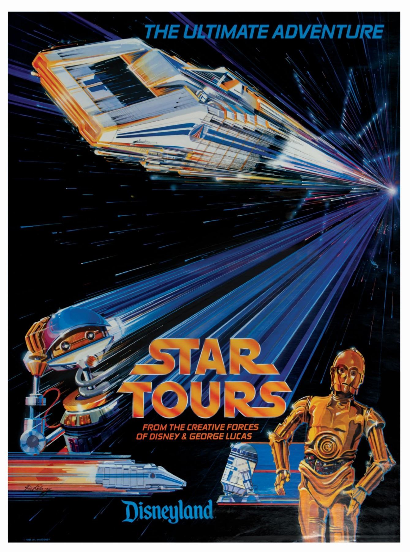 (Disneyland, 1986) A souvenir poster featuring imagery from Disneyland's Star Tours attraction. The poster was created by artist Tim Delaney, and was available in Tomorrowland during 1986 to coincide with the opening of the attraction. The poster features the characters and ride elements found in the attraction and measures 24"x18". The condition is good with a few creases and minor wear from use.