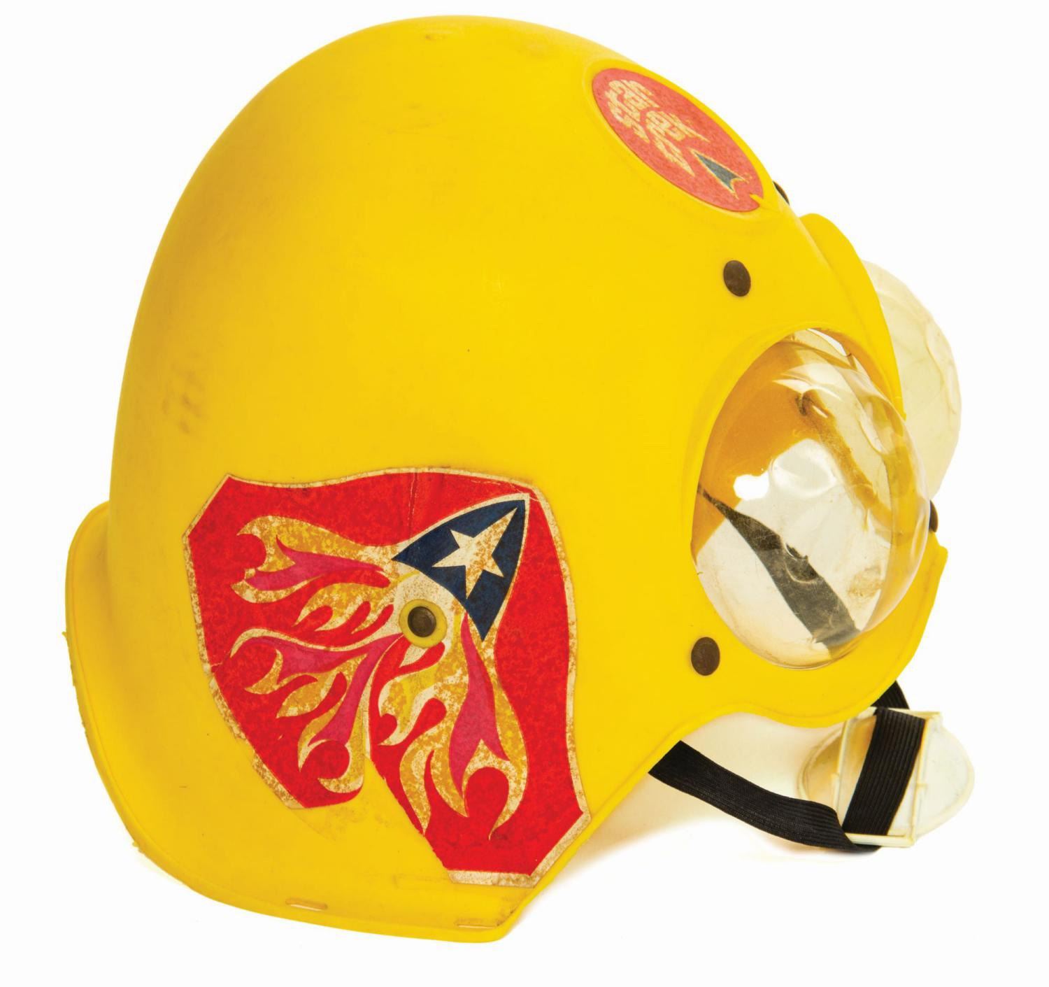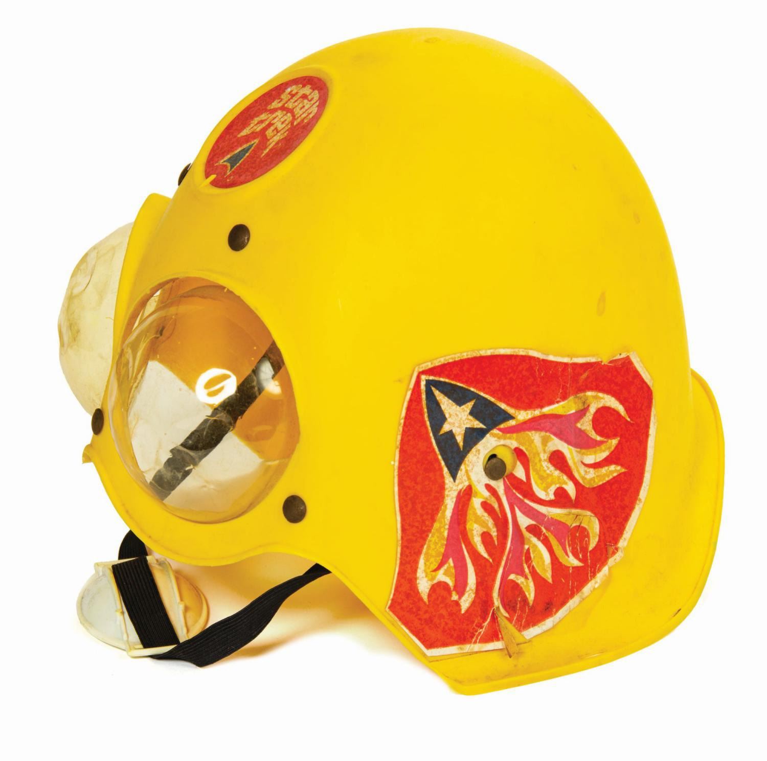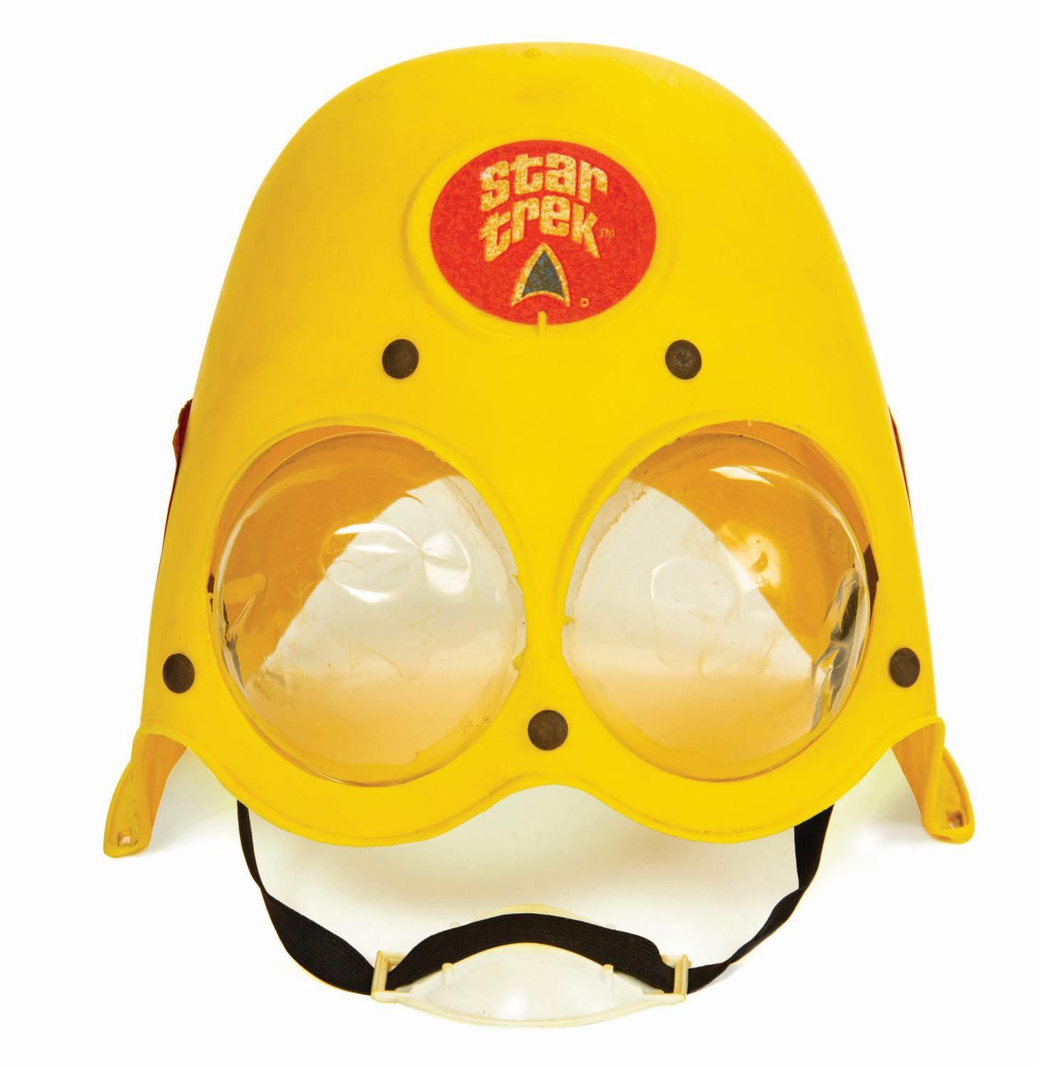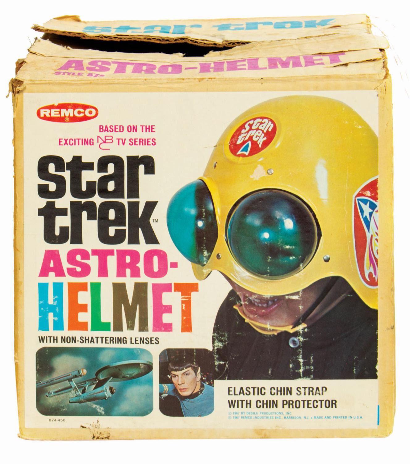 (Remco, 1967) A very rare Star Trek Astro Helmet with box. The helmet design was created by Remco in 1964 but was given a Star Trek retheme in 1967 due to the popularity of the show, which debuted the year prior. The helmet sports an unusual design, as it was not based on a helmet used within the show, but rather was decorated with sticker imagery based on the Starfleet Insignia. The box includes great imagery of Spock and the USS Enterprise. The molded soft plastic helmet, containing "non-shattering lenses" and an elastic chin strap with chin protector, measures approximately 8" tall. The condition is good with wear throughout from use including some discoloration and torn portions of the sticker images, and small dents in the lenses.