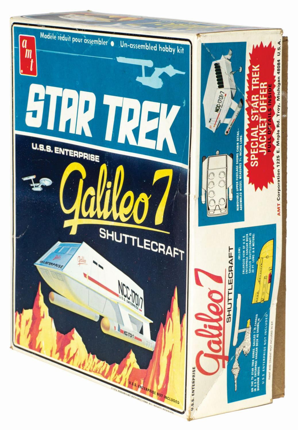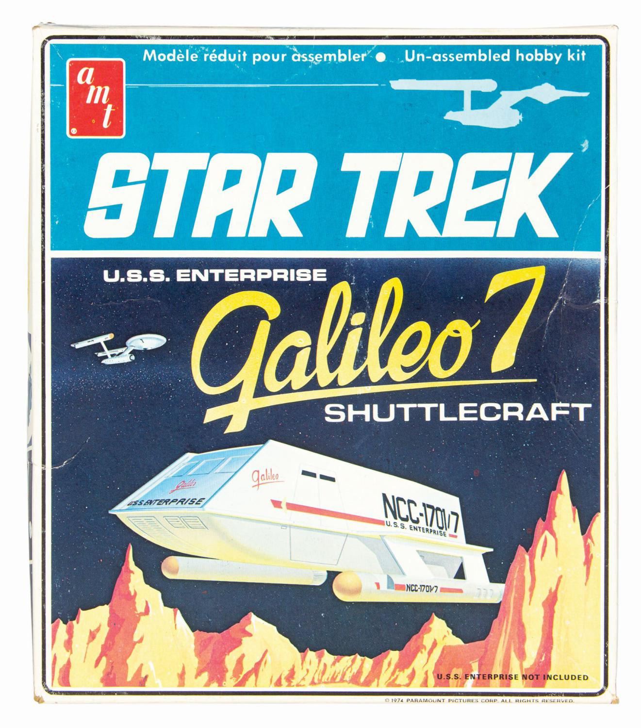 (AMT, 1974) A vintage 1:35 scale model kit of the Galileo 7 Shuttlecraft from Star Trek manufactured by AMT. Completely unused, all the plastic model components are still attached to their runners. The decal sheet with "U.S.S. Enterprise", "NCC-1701/1", and "Galileo" badging is intact, and the instruction manual is included. Measuring 10"x8.5" and 3" deep, the original box is in very good condition. It exhibits some minor denting to the lid, faint creases, and edge and corner wear. The kit is as-new, and the instruction manual exhibits browning from age.