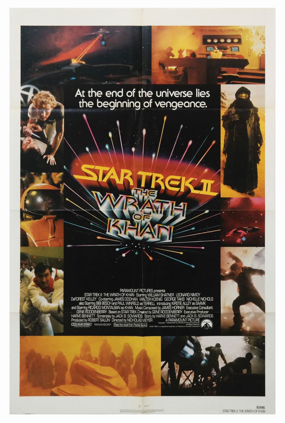 (Paramount, 1982) An original one sheet poster for Star Trek II: The Wrath of Khan. After a less than ideal performance by Star Trek: The Motion Picture, The Wrath of Khan was a critical and financial success and has been credited with renewing interest in the franchise as a whole. Measuring 41"x27", the poster is in good condition with some wear along the original fold-lines and minor yellowing at the edges.