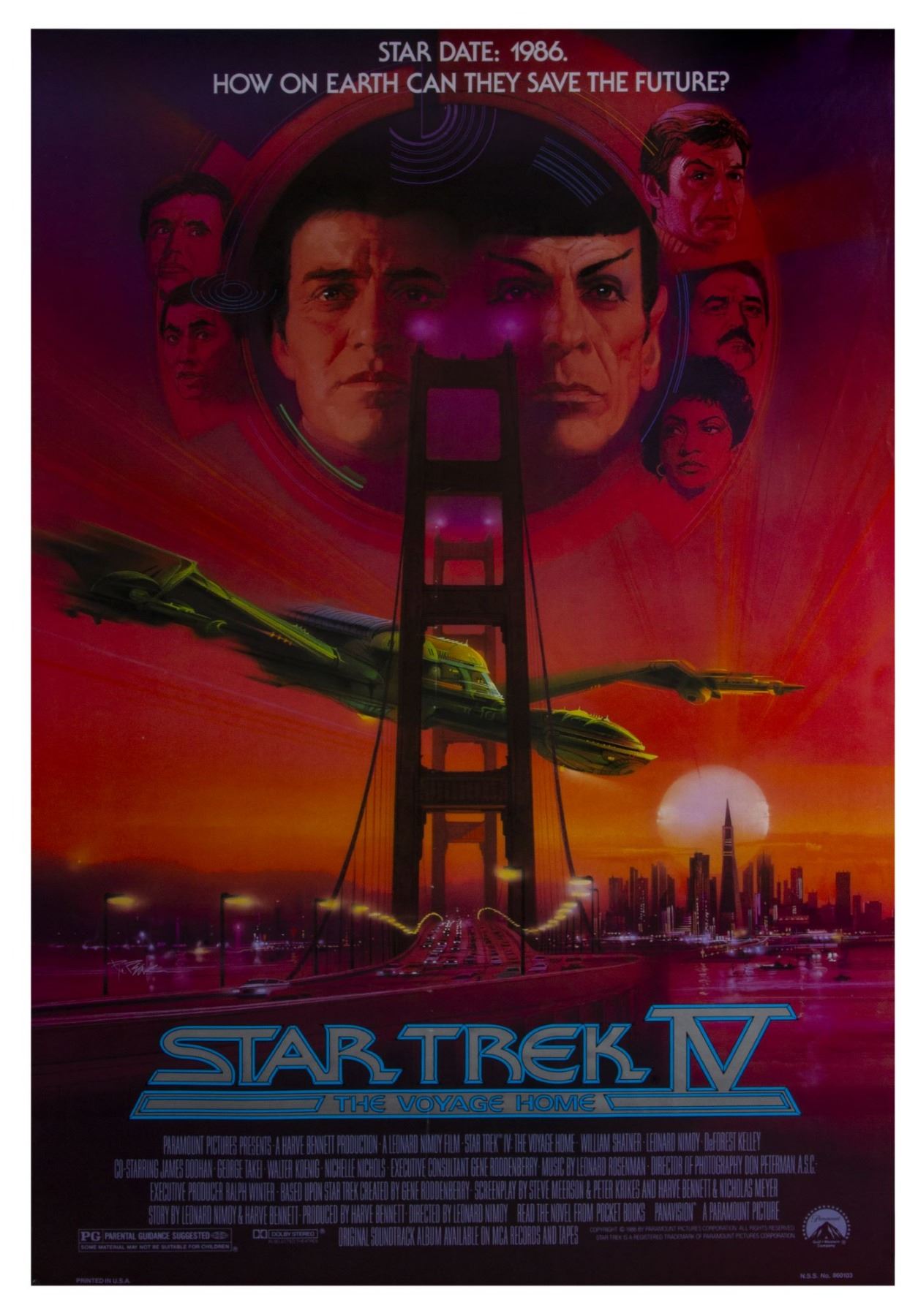 (Paramount, 1986) A theatrical release one sheet movie poster for "Star Trek IV: The Voyage Home". The poster features the incredible artwork of Bob Peak and depicts the crew and the Starship USS Enterprise above a 1986 San Francisco. Measuring 40"x27", the poster is in good condition with minor creasing and wear throughout from storage, and a crease mark in the center of the bottom portion of the poster.
