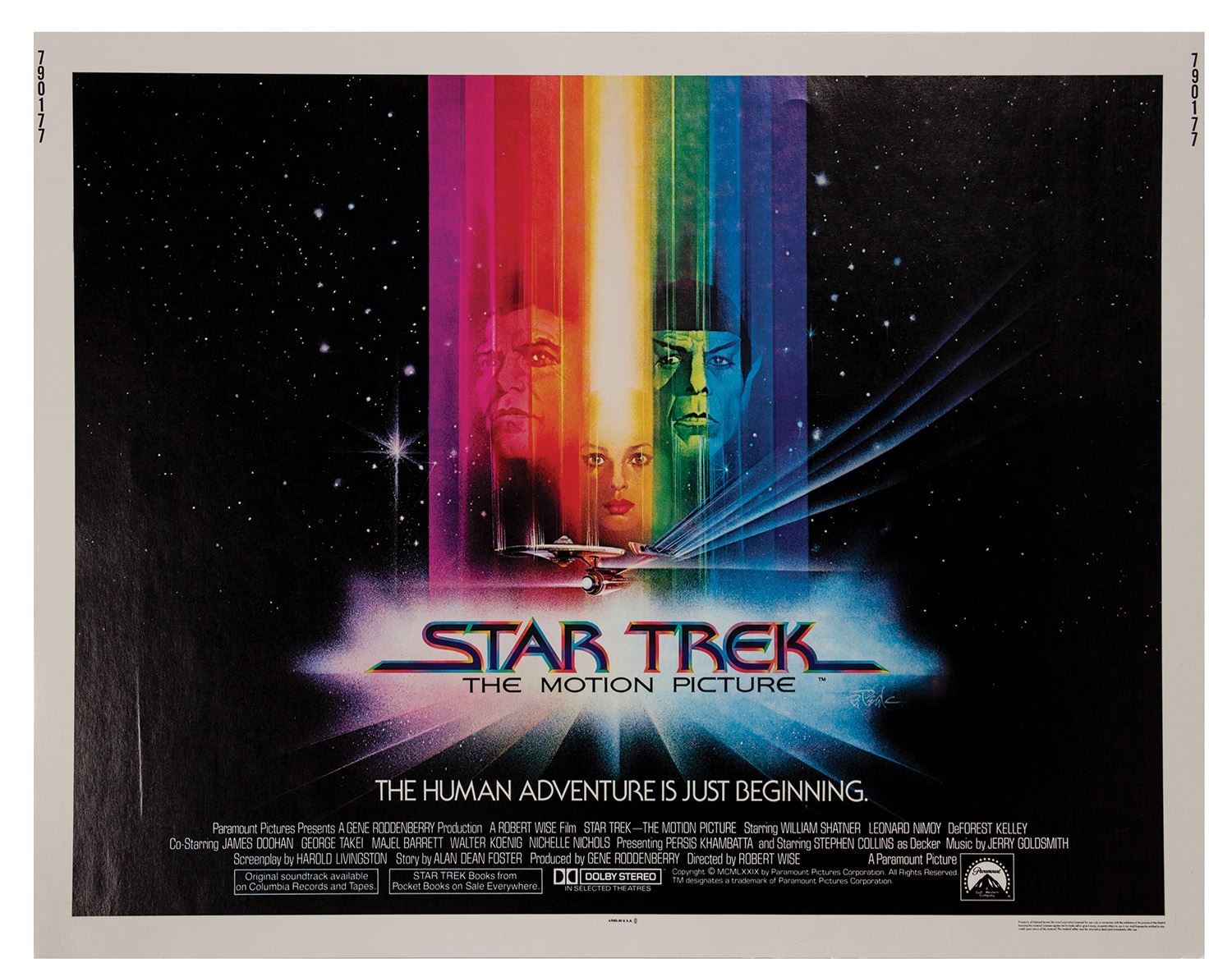 (Paramount, 1979) A rare original half-sheet poster for Star Trek: The Motion Picture. Featuring the iconic artwork of Bob Peak, this poster comes from the personal collection of Bill Wallen, who helped create promotional and advertising campaigns for the film. Measuring 22"x28", this poster is in fair condition with some scratches and creases from storage. The reverse has some minor yellowing.