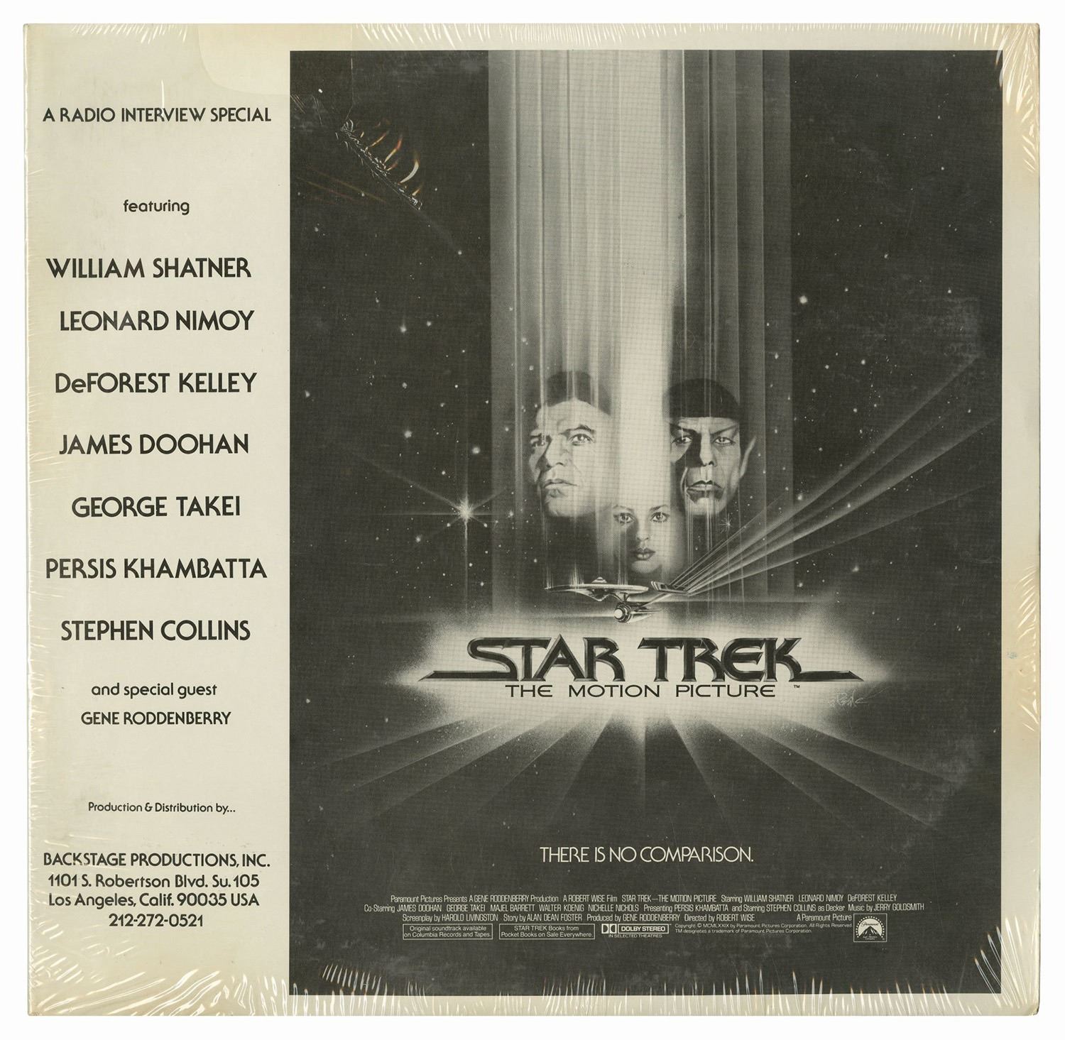 (Paramount, 1979) A radio interview record for Star Trek: The Motion Picture. Records such as these were sent to radio stations with a list of questions and cues included, so that local radio stations could "interview" the cast of the film or play single quotes. This unopened record contains both the press release from the studio and the cue sheet. Measuring 12.5"x12.5", the record is in very good condition and is still in its original packaging with several spots of tearing to the plastic.