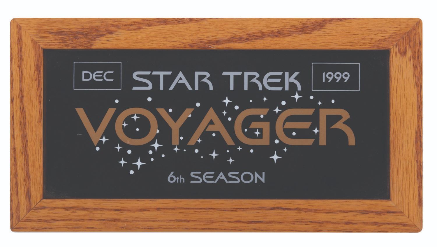 (Paramount, 1999) A very rare Star Trek Voyager sixth season cast and crew gift plaque. Plaques such as this one were made each year of the series exclusively for the cast and crew and were never available to the public. Constructed of wood and acrylic, the plaque measures 6.5"x12.5"x1" and is in very good condition, with light scuffs from handling.