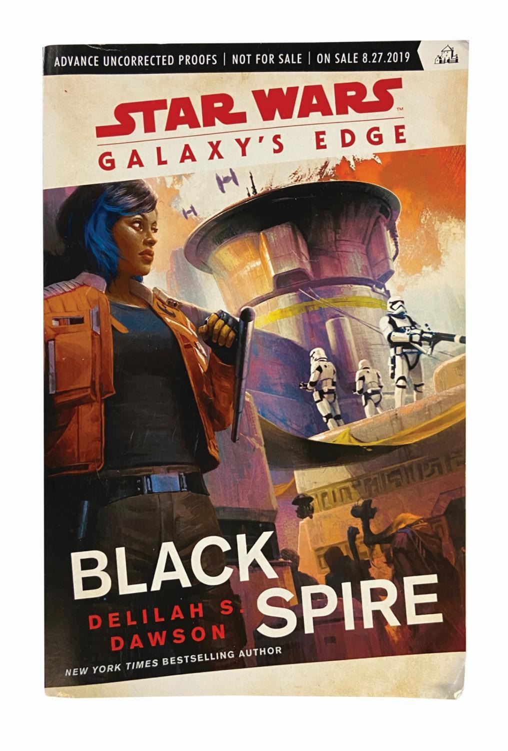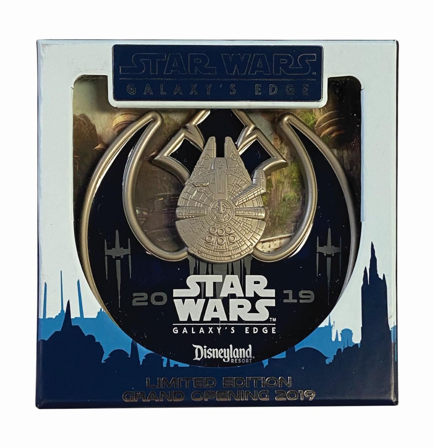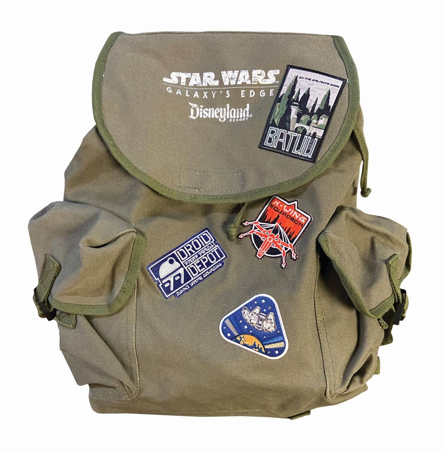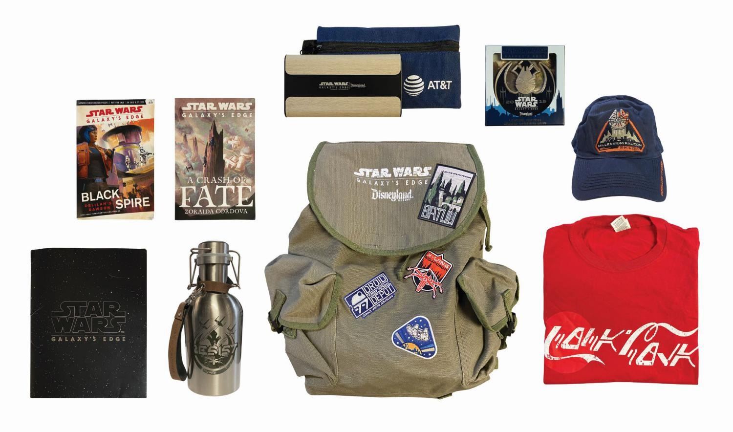 (Disneyland, 2019) A Star Wars Galaxy's Edge press kit. This press kit includes a backpack, shirt, two books, portable charger, water flask, hat, commemorative pin, shopping bag, and a folder. The folder holds a Star Wars comic book and information about the new Galaxy's Edge attraction. All the items feature original Star Wars Galaxy's Edge logos and imagery. The items measure between 17"x17" and 4.25"x4.25". The items are in fine condition with minor wear from use.