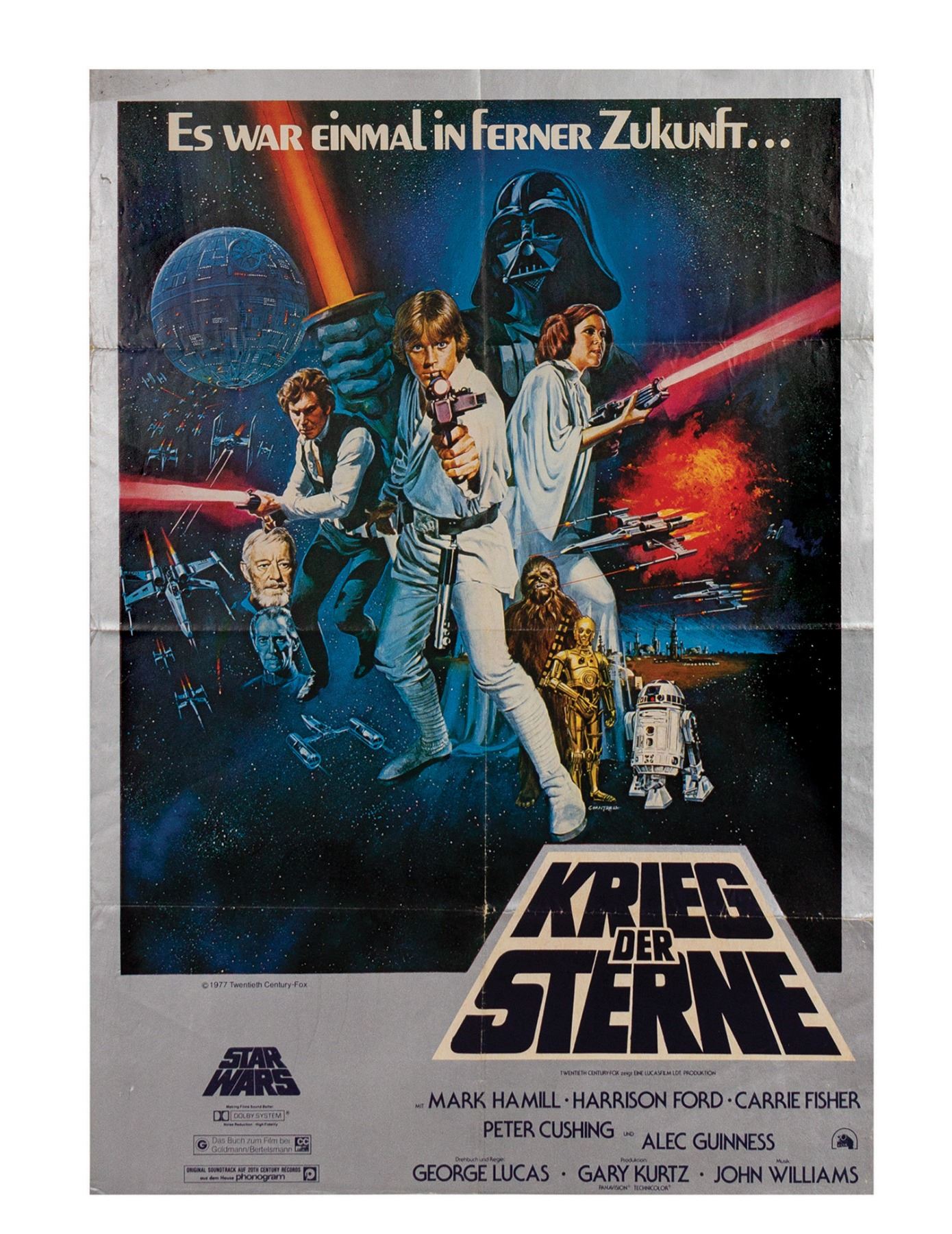 (20th Century Fox, 1977) A Style-C German A1 poster for Star Wars. This poster features a wonderful action image illustrated by Tom Chantrell, with the German title for the film displayed in the lower-right. The poster measures 33"x23.25" and is in good condition with some wear along the original fold lines and edges, and a few pin holes around the border from previous display.