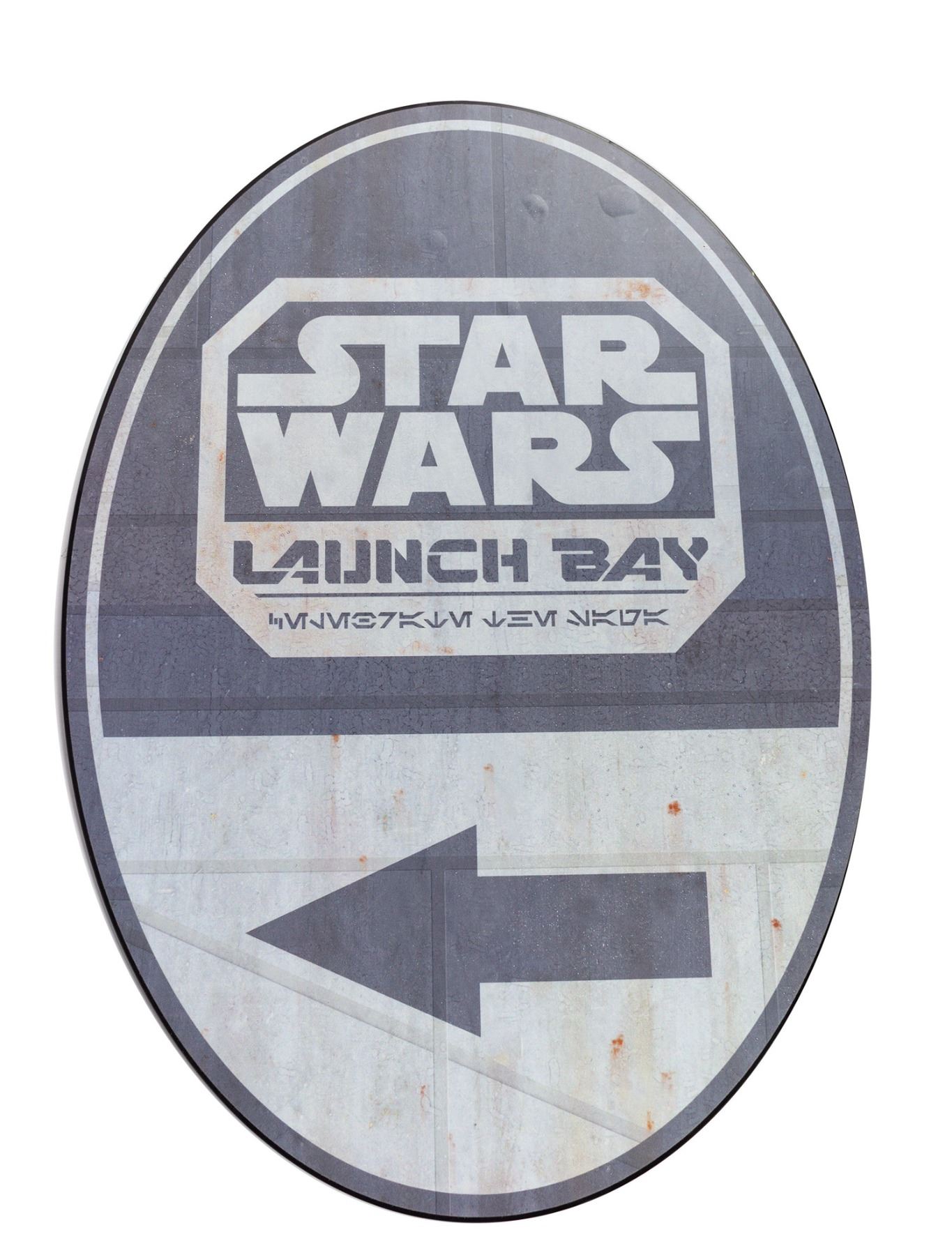 (Disneyland, c.2015) A sign used to direct park guests to the Star Wars Launch Bay at Disneyland. Featuring the Star Wars Launch Bay logo, this sign is printed on acrylic board and has adhesive strips along the back from the sign's original use. Measuring 25"x18", the sign is in good overall condition with a few small air bubbles in the printed imagery.