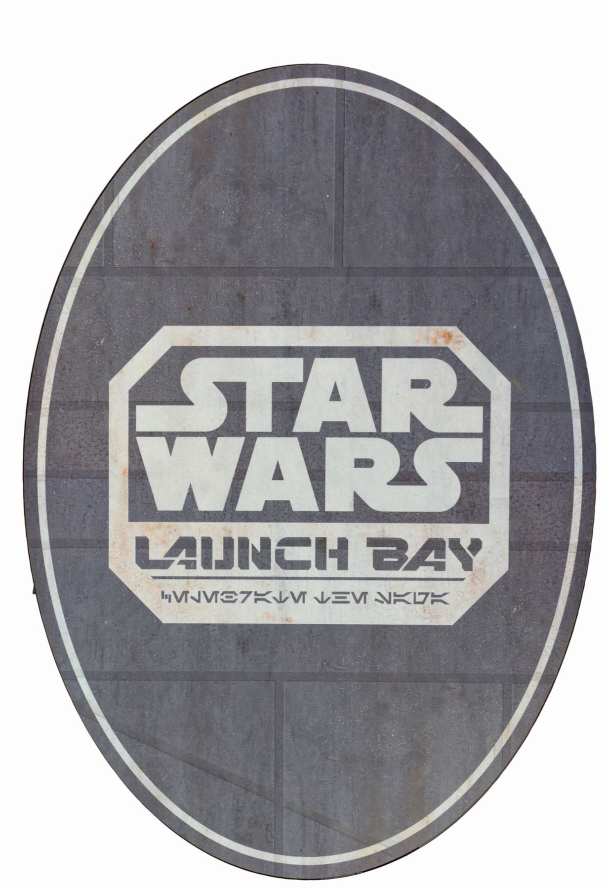(Disneyland, c.2015) A sign used within the Star Wars Launch Bay at Disneyland. This style of sign was used on stanchion poles and is printed on acrylic board. The sign has adhesive strips along the back from its original use. Measuring 25"x18", the sign is in good overall condition with an intentionally distressed look and minor surface wear.