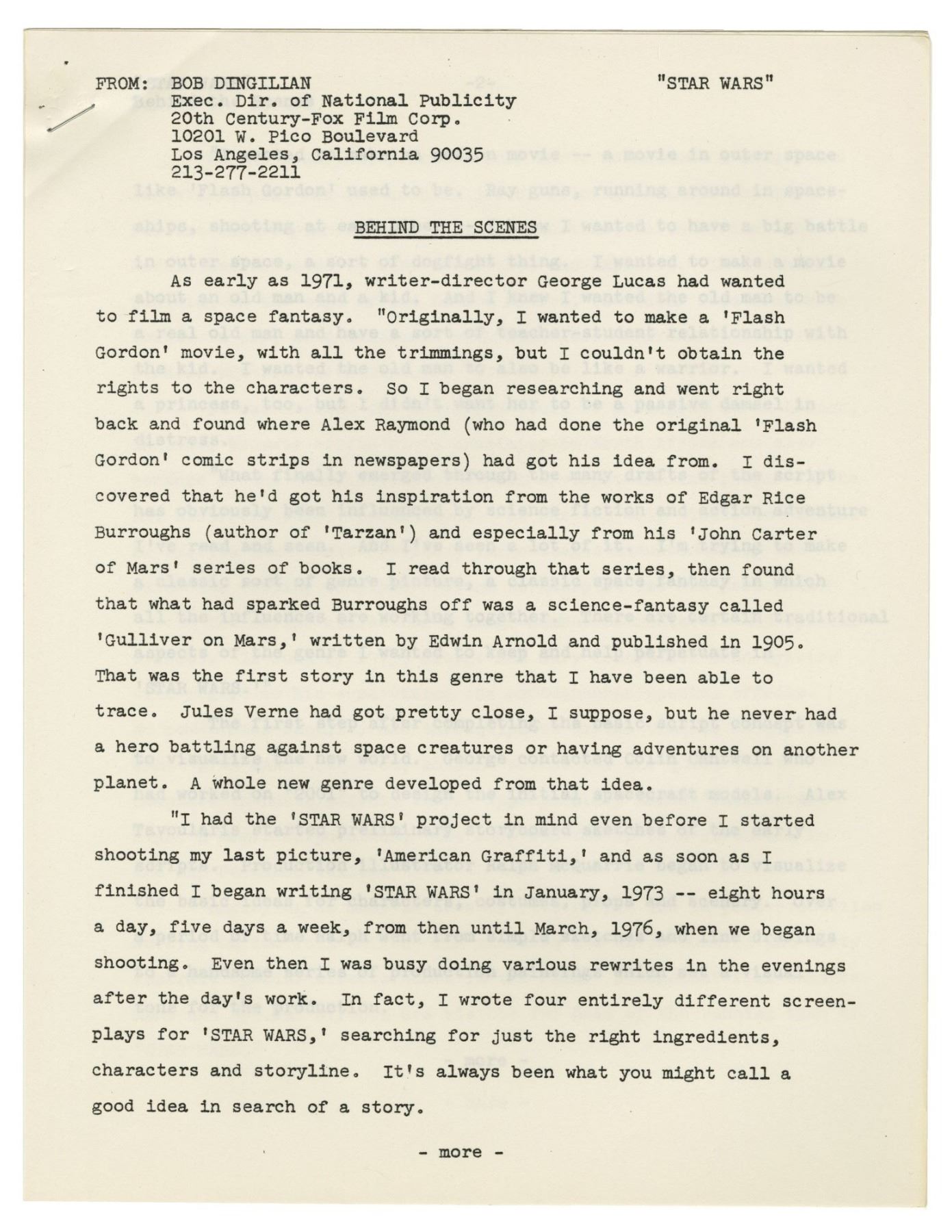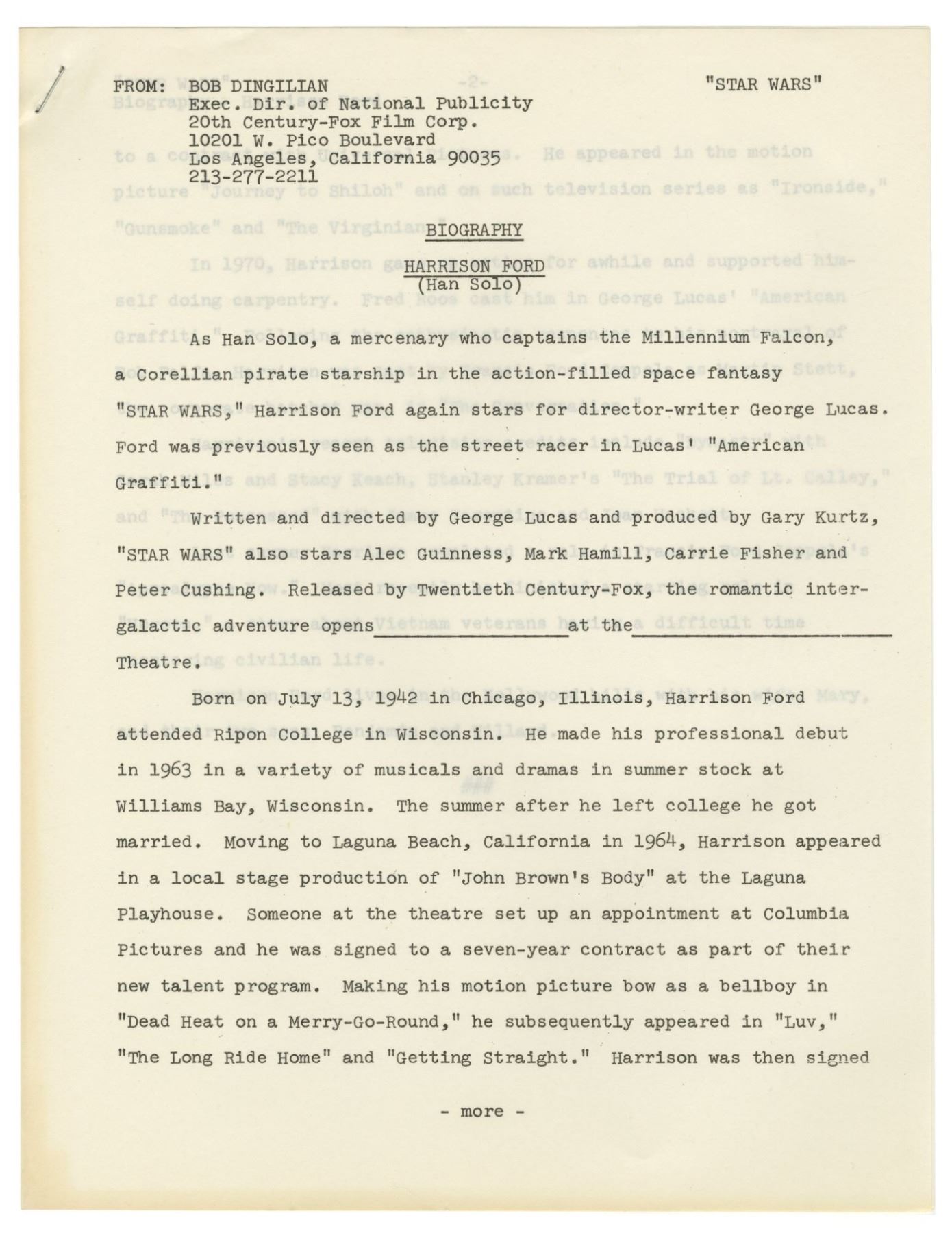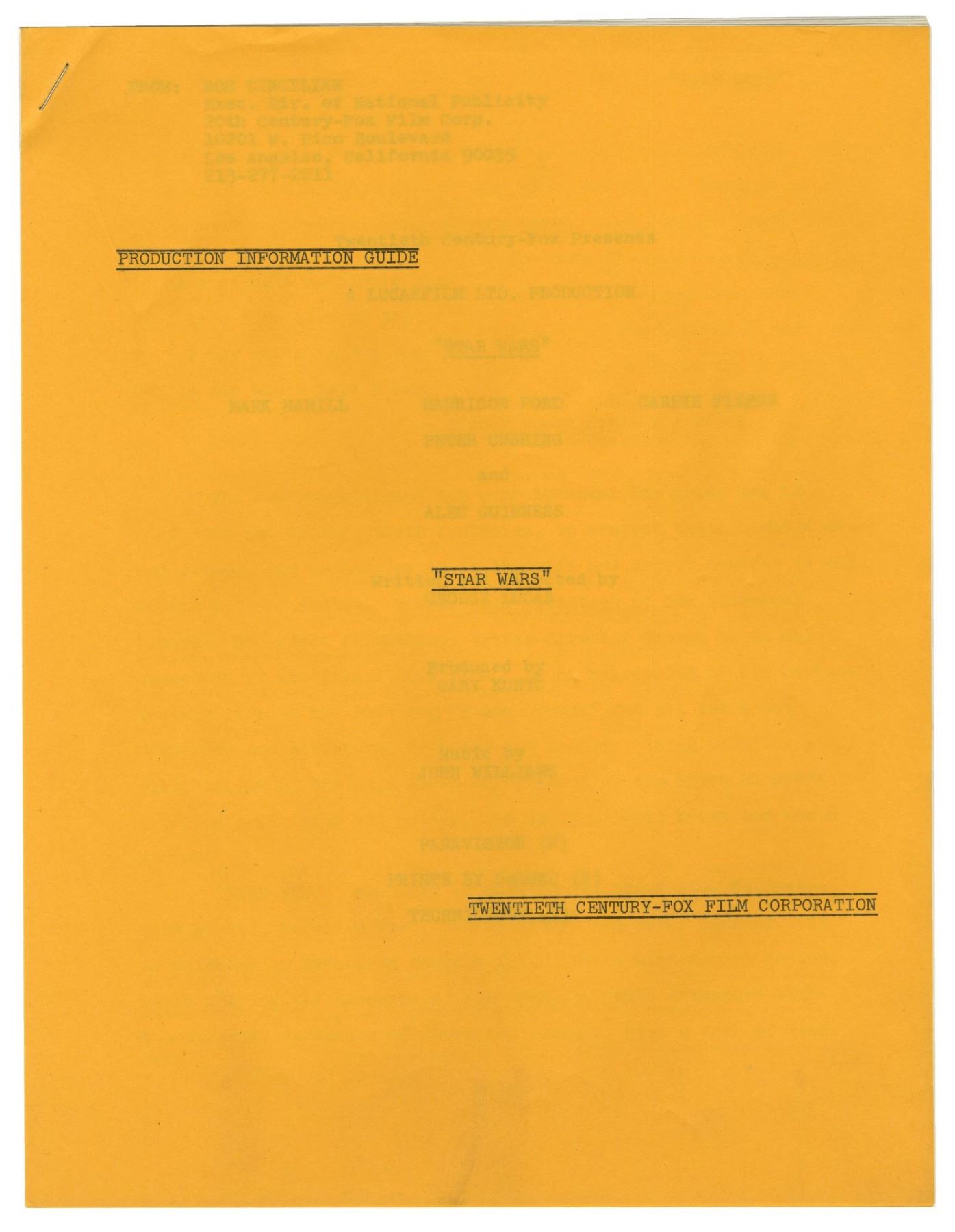 (20th Century Fox, 1977) An extremely rare "Production Information Guide" created for very early promotion of the original theatrical release of "Star Wars". This packet comes from the collection of Bill Wallen, who was given this information to use while he was creating early promotional and advertising campaigns for the film. The cover sheet has the title "Star Wars" with "Twentieth Century-Fox Film Corporation" listed in the bottom-right corner. The packet is composed of 37 individual sections, many of which have multiple pages stapled together for a total of over 100 sheets. The sections include biography summaries of the principal cast, behind-the-scenes information, cast and crew lists, and much more. The pages measure 11"x8.5" and the condition is very good with minor wear to a few pages from use. Wallen underlined several sections of information while using these sheets. Original paper materials such as these that were created and used to promote the original "Star Wars" are exceptionally scarce, and provide a fascinating look into the period leading up to the release of one of the biggest films of all time.