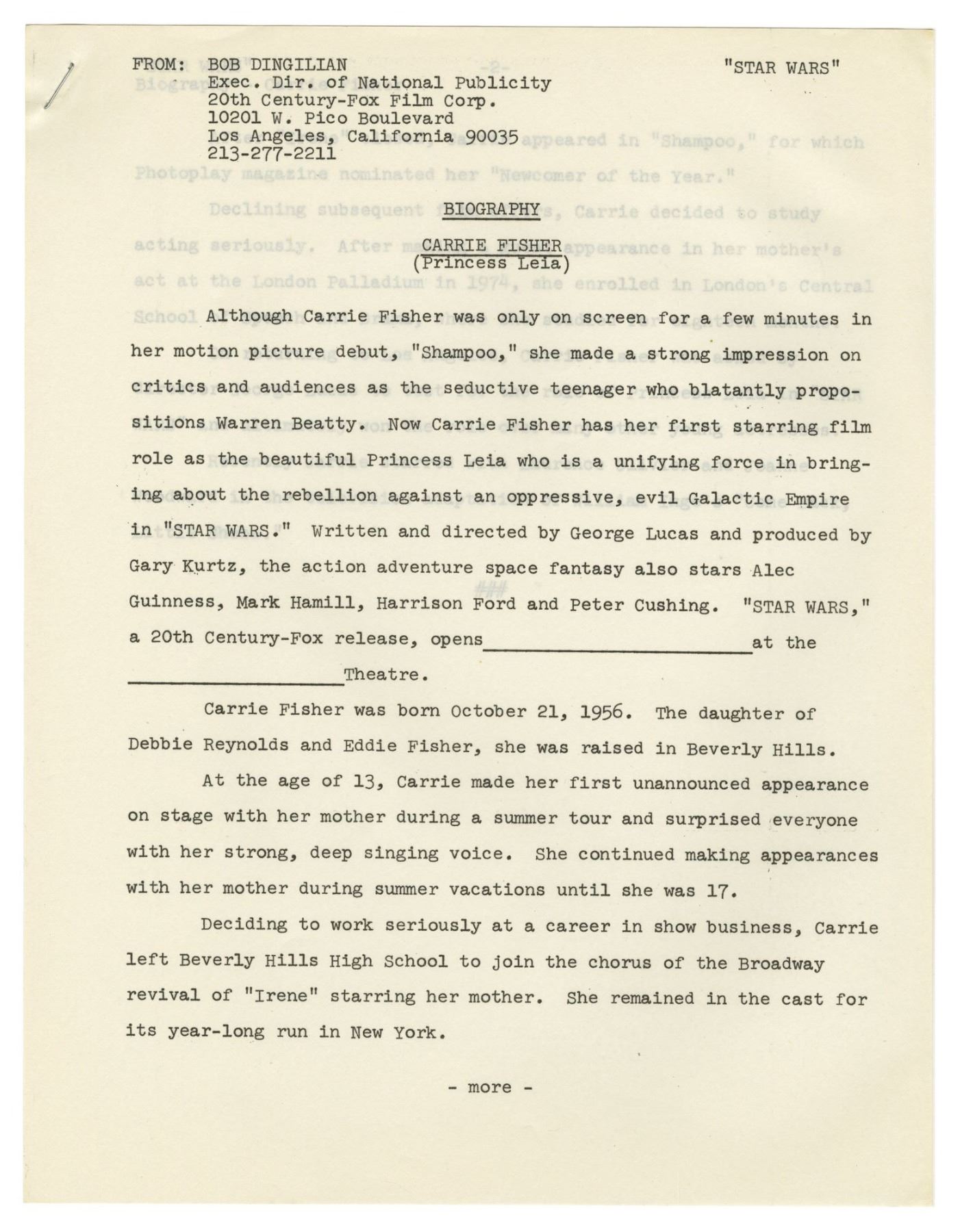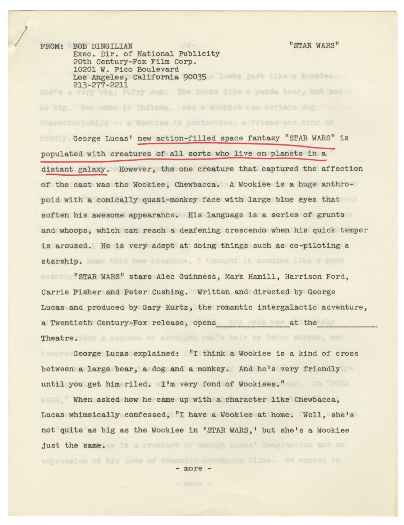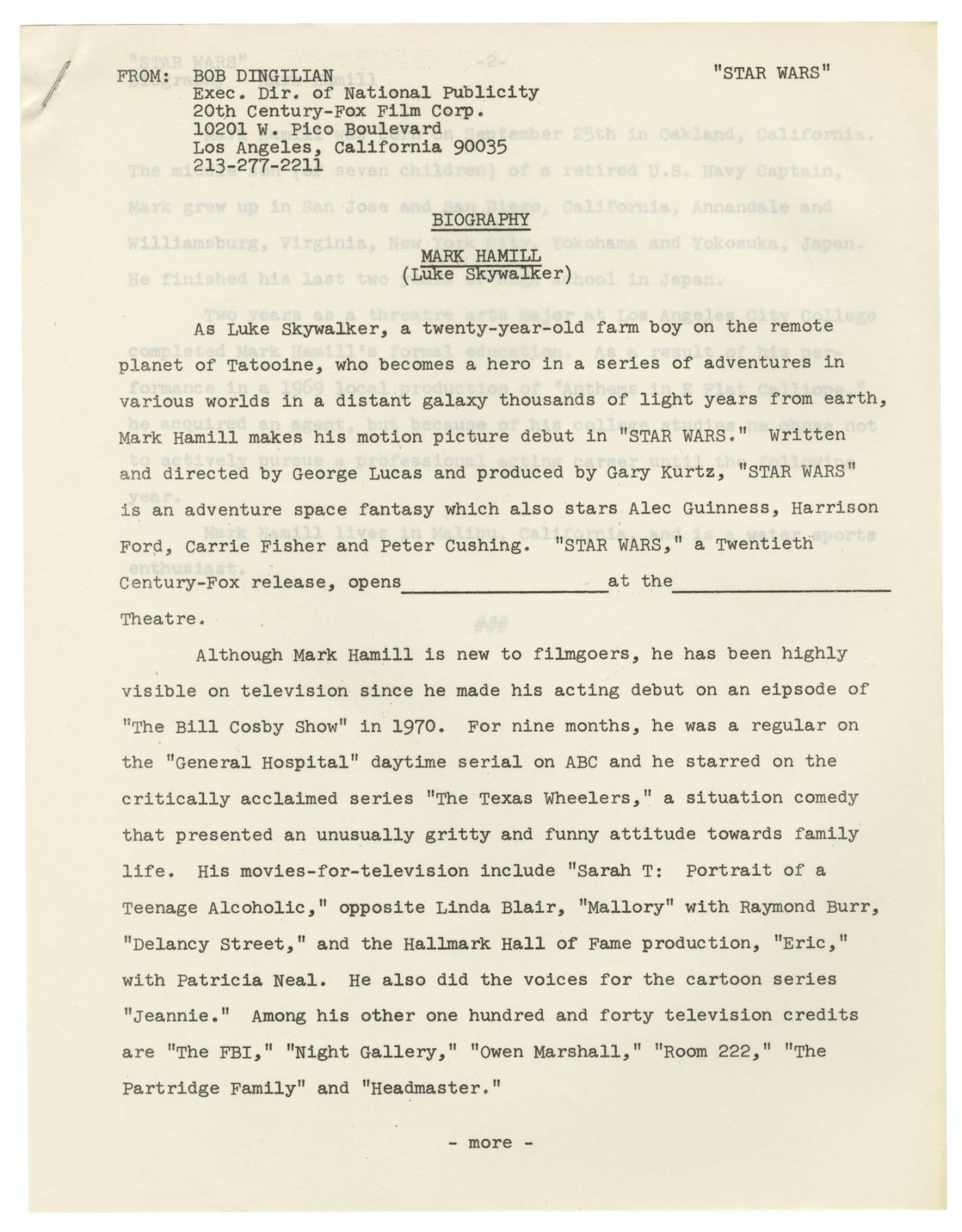 (20th Century Fox, 1977) An extremely rare "Production Information Guide" created for very early promotion of the original theatrical release of "Star Wars". This packet comes from the collection of Bill Wallen, who was given this information to use while he was creating early promotional and advertising campaigns for the film. The cover sheet has the title "Star Wars" with "Twentieth Century-Fox Film Corporation" listed in the bottom-right corner. The packet is composed of 37 individual sections, many of which have multiple pages stapled together for a total of over 100 sheets. The sections include biography summaries of the principal cast, behind-the-scenes information, cast and crew lists, and much more. The pages measure 11"x8.5" and the condition is very good with minor wear to a few pages from use. Wallen underlined several sections of information while using these sheets. Original paper materials such as these that were created and used to promote the original "Star Wars" are exceptionally scarce, and provide a fascinating look into the period leading up to the release of one of the biggest films of all time.
