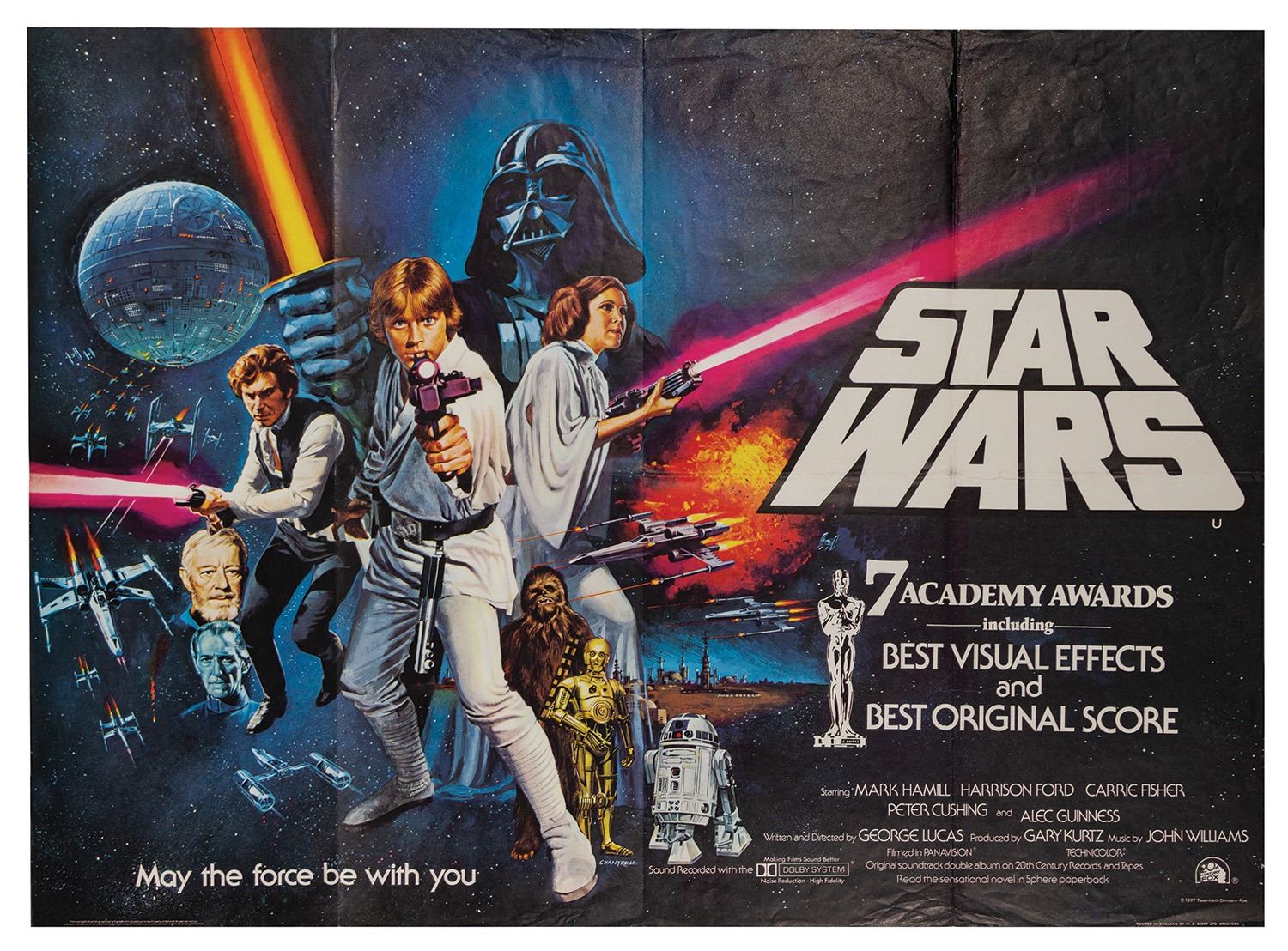 (20th Century Fox, 1977) An original Style-C British Quad poster for Star Wars. This poster is the Academy Awards variant, which proudly proclaims that the film won seven Academy Awards including Best Visual Effects and Best Original Score. Measuring 30"x40", the poster is in good condition with small creases and surface wear. There is minor wear along the edges and the original fold lines.