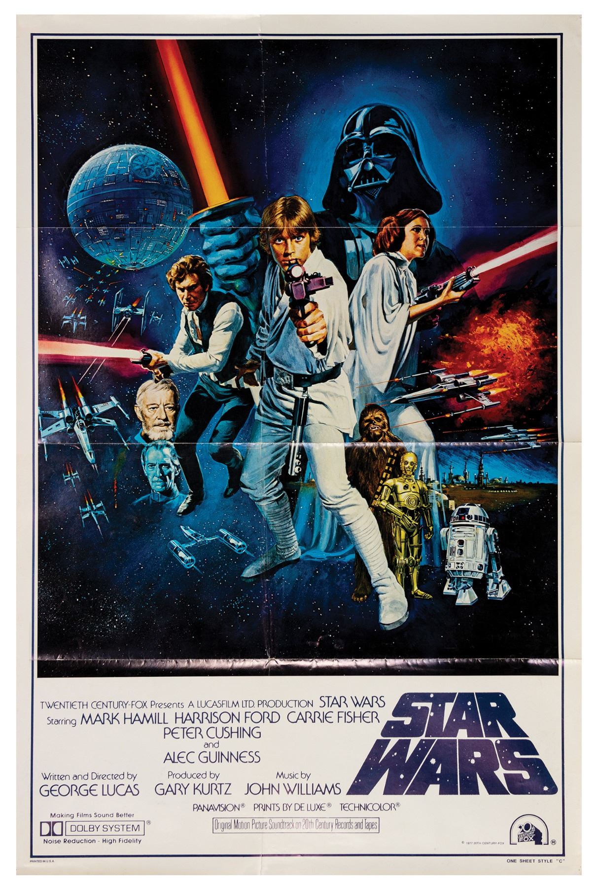 (20th Century Fox, 1977) A very rare original Style-C one sheet poster for Star Wars. This poster was intended for international markets, and it is believed that less than 1000 were ever issued. There are no thin lines on Leia or R2-D2, which are seen on counterfeits of this hard to come by poster. Measuring 41"x27", the poster is in fair condition with wear to its original fold lines and edges, including vertical creases through the center and a small tear at the bottom-edge.