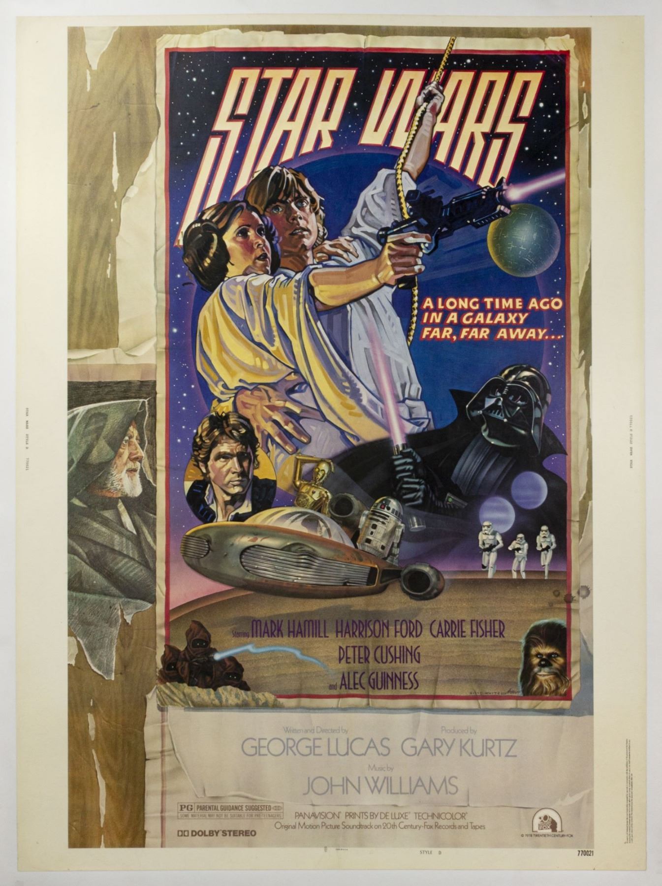 (20th Century Fox, 1977) An original Style-D 40"x30" cardstock poster created by Charlie White and Drew Struzan for the original Star Wars. Several aspects of this poster are scarcely seen, including the unusual font choice for the title, as well as the torn-looking quality to the background artwork. The torn look was a last-minute creative decision to allow extra room around the artwork for additional text. The poster is in very good condition overall with some minor tears around the edges and some faint creases throughout. The poster is mounted to conservation paper and has an additional inch of the conservation paper around the border.