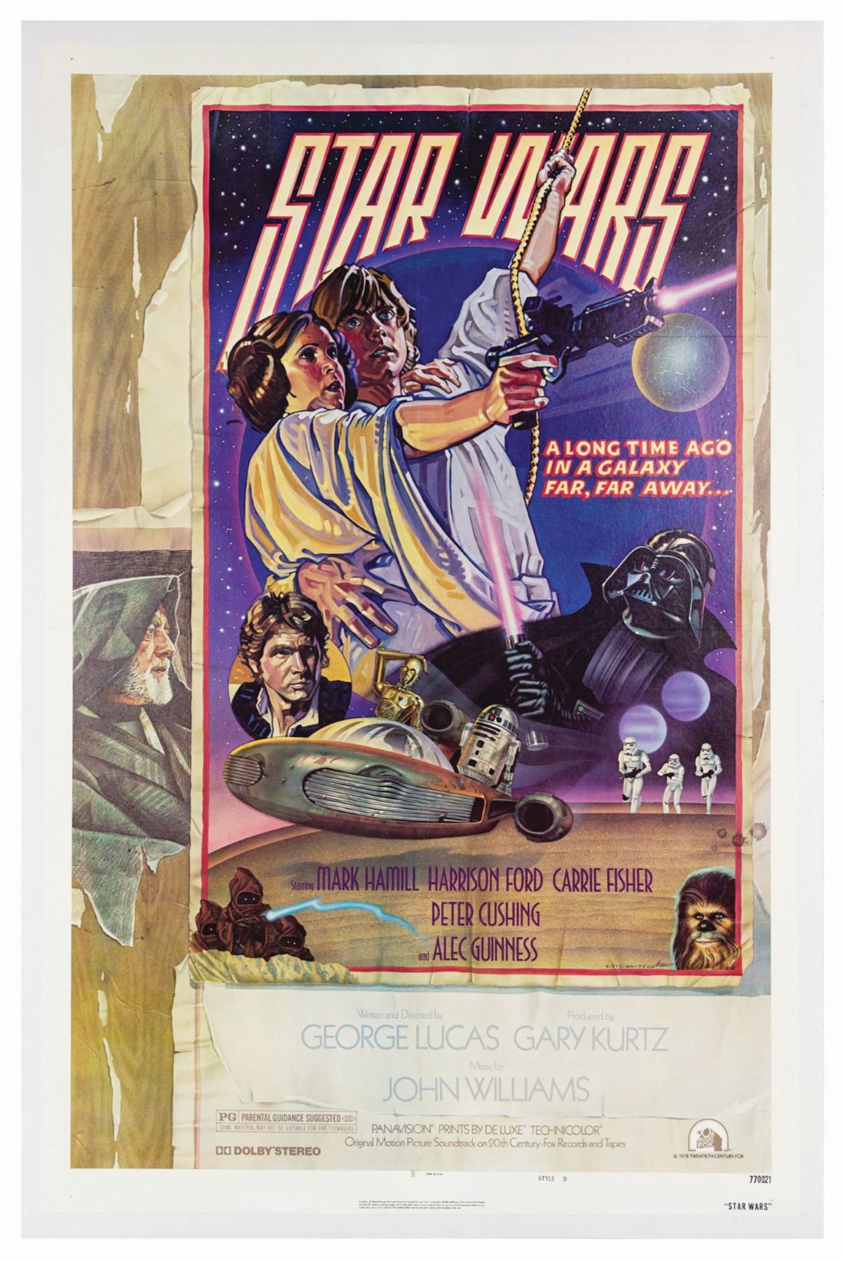 (20th Century Fox, 1977) An original Style-D one sheet poster created by Charlie White and Drew Struzan for Star Wars. Several aspects of this poster are scarcely seen in alternate Star Wars posters, including the unusual font choice for the title, as well as the torn-looking quality to the background artwork. The torn look was a last-minute creative decision to allow extra room around the artwork for additional text. Measuring 41"x27.5", the poster is in good condition with minor wear to the original fold lines and edges. The poster has been linen-backed for its future preservation.