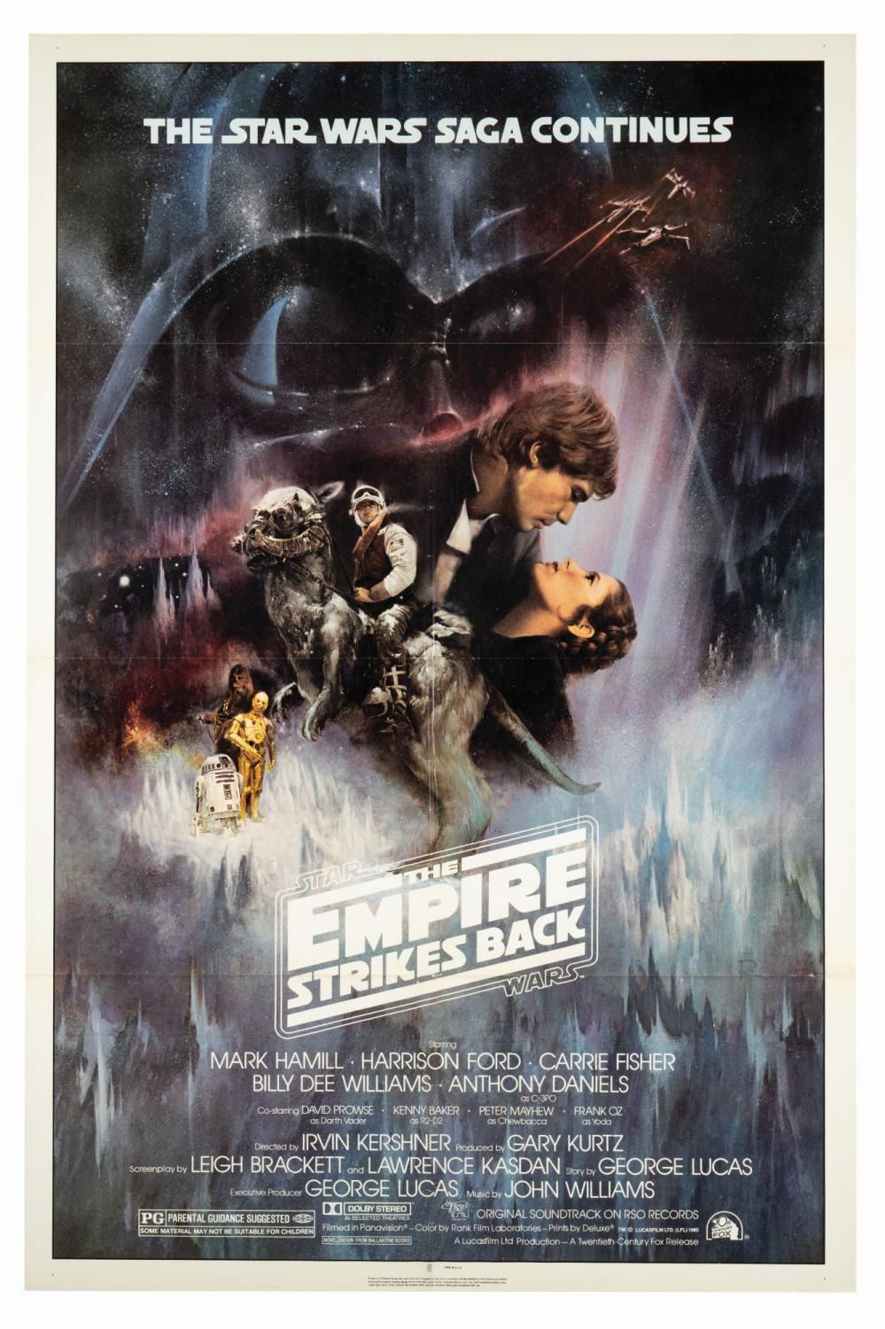 (Lucasfilm, 1980) A very rare original release one sheet Style-A poster for The Empire Strikes Back. The saga of Luke Skywalker, Han Solo, Princess Leia, and Darth Vader continues as The Empire Strikes Back in "Gone with the Wind" style layout and imagery by artist Roger Kastel. Measuring 27"x41", the poster is in good condition with a few indentations and creases and wear along the original fold lines.