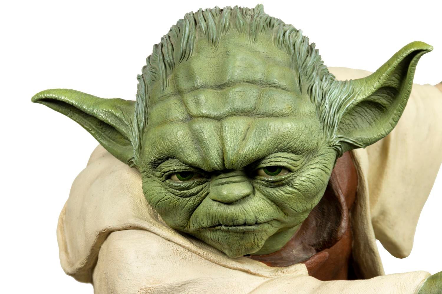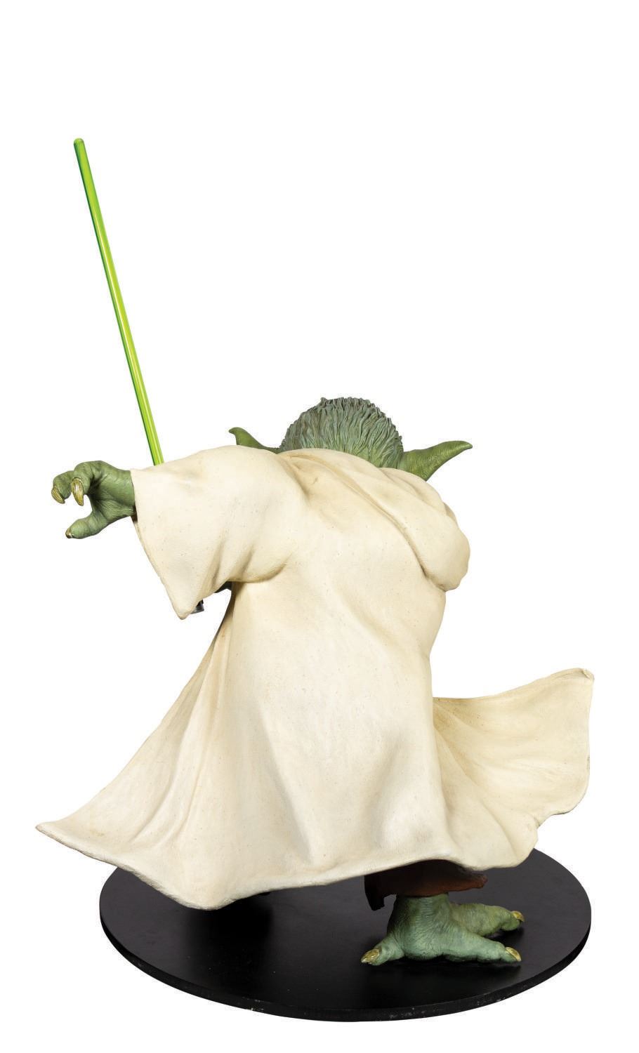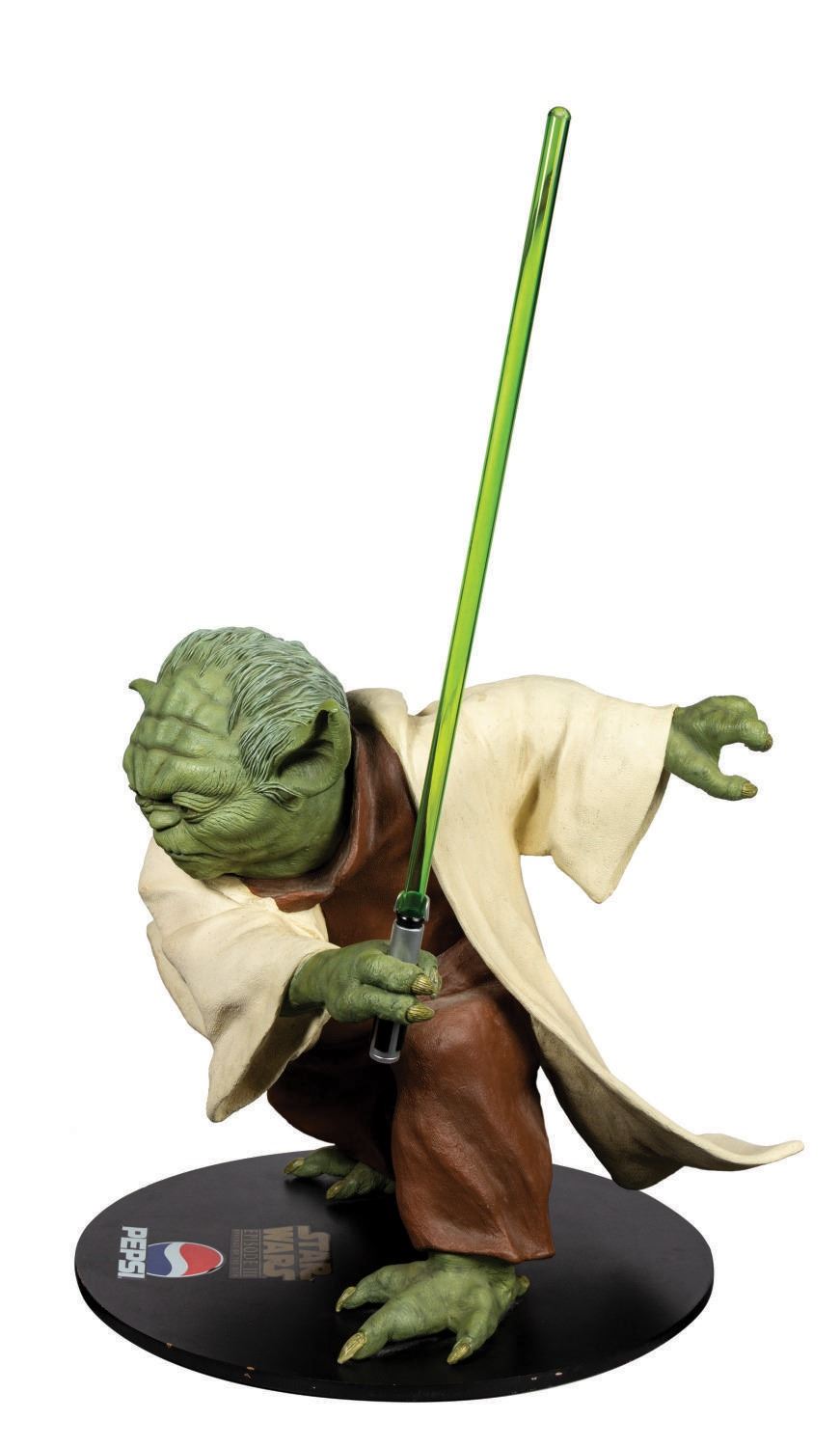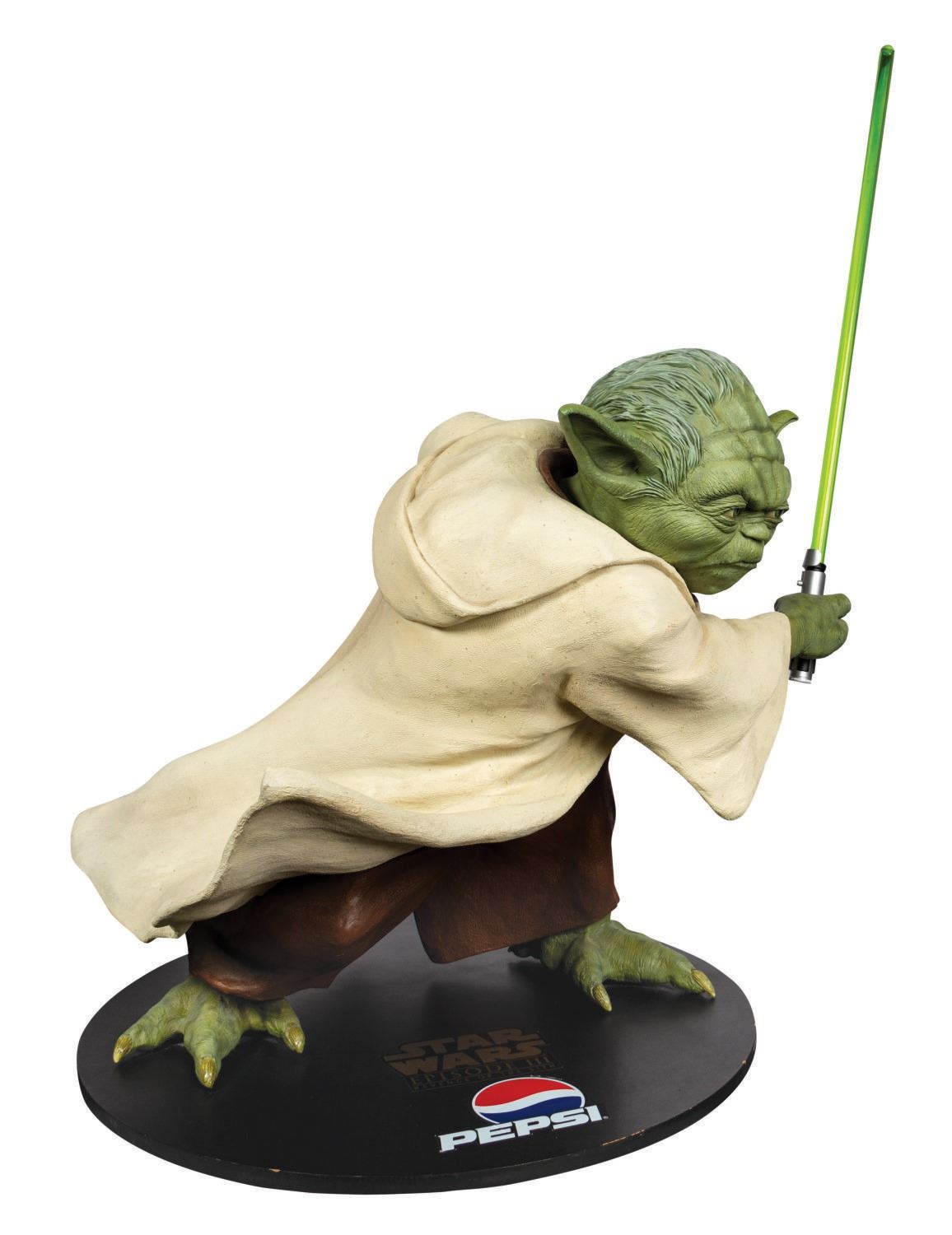 (Tic-Toc Industries, 2005) A very rare life-size Yoda figure that was created by Tic-Toc Industries for a Pepsi promotion relating to Star Wars Episode III: Revenge of the Sith. Fewer than 1000 of these highly detailed figures were ever created, with this figure wonderfully representing the iconic character with his green lightsaber and fierce expression. The film's logo is depicted on the base, and the figure stands 44" tall including the lightsaber. The condition is very good with some wear to the base from previous display. This item will require special shipping arrangements. Please contact us for details and estimates.