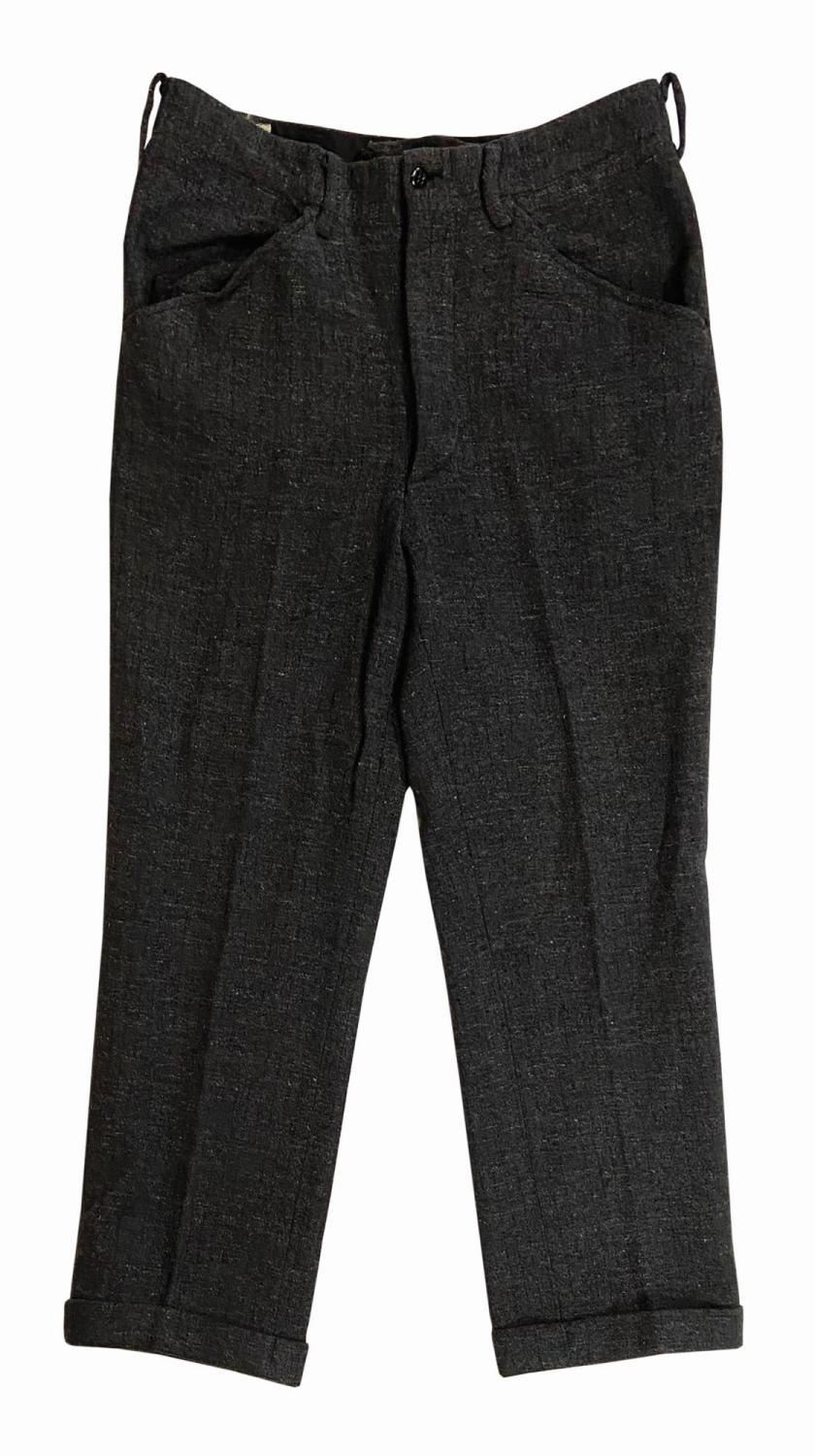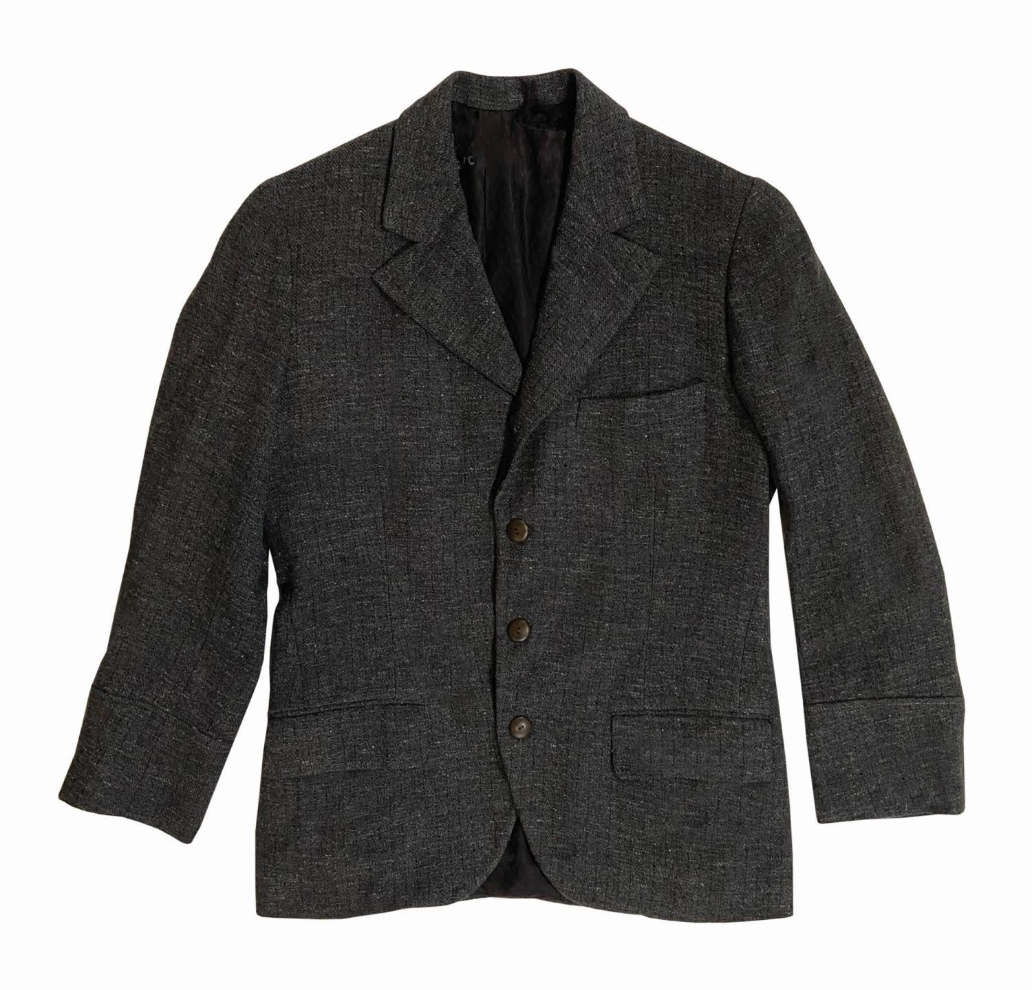(Warner Bros., 1978) A vintage period suit worn by Steve McQueen as Dr. Thomas Stockmann in An Enemy of the People. Constructed of charcoal wool, the suit includes a jacket with notched lapels, hip flap pockets, broad welt breast pocket, interesting sleeve cuff hemline detail, and four-button front closure. The patterned black silk lining retains two interior chest pockets and is marked in the right sleeve with Western Costume notation and size 42R. The matching trousers have cuffed legs, side welt pockets, and button and hook and eye front closure. They retain an internal Western Costume bias label typed, "24101-1 Steve McQueen Waist 36." A passion project of McQueen's, An Enemy of the People is an adaptation of the classic play by Henrik Ibsen in which can be seen the roots of environmentalism. McQueen threw all of his star power behind the project, even touring with the film to lecture at universities. The suit remains in very good condition. The lining of the jacket exhibits some shattering, most pronounced at arm openings. The pants and jacket both exhibit a few internal tears and small threadbare areas.