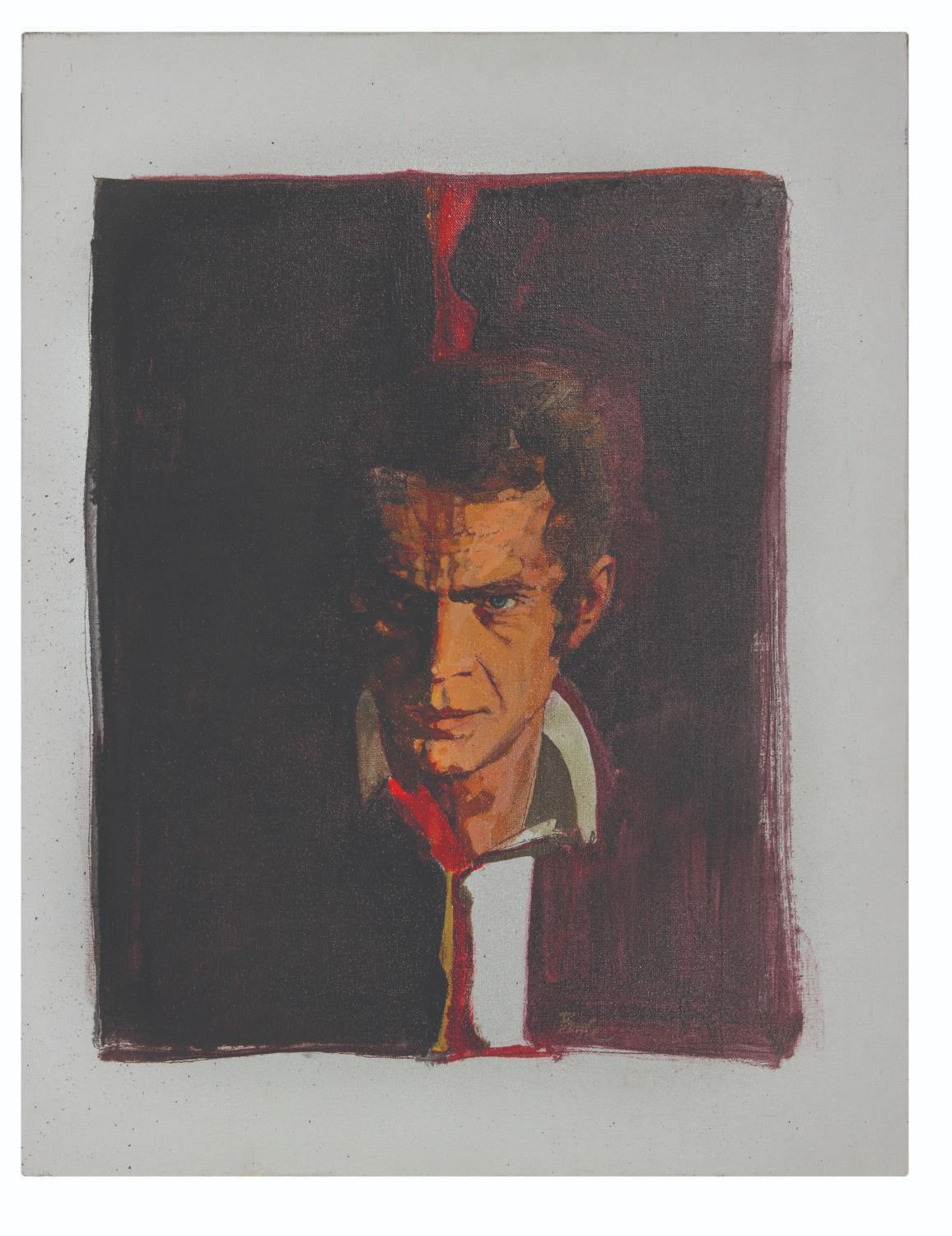 (c.1970s) An original portrait painting of legendary actor and style icon Steve McQueen. Accomplished in oils on stretched canvass, the painting depicts a stylized head-and-shoulders view of the steely-eyed leading man against a moody color block backdrop. The piece is signed by the artist at lower right, "Boyle." Measuring 21.5"x17.5" on the 28"x22" canvas, the artwork is in fine condition. There is some minor wear to the edges of the canvas, well away from the painting.