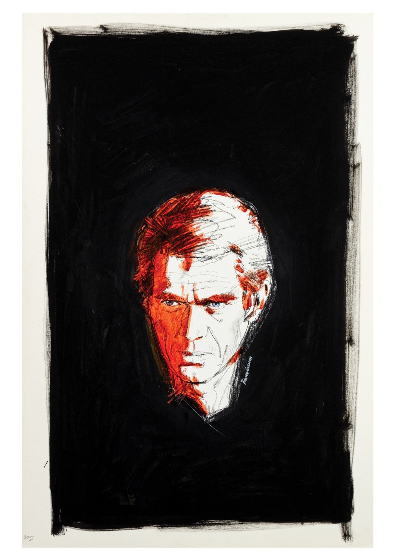 (Unknown, c.1970s) An original painting by poster artist Robert Tanenbaum for an unknown Steve McQueen film. This artwork is believed to have been created for an unused Steve McQueen film poster, and is accomplished in acrylic on art board. Measuring 30"x20", the painting is in very good condition with minor surface scuffs. Tanenbaum signed the lower-right.