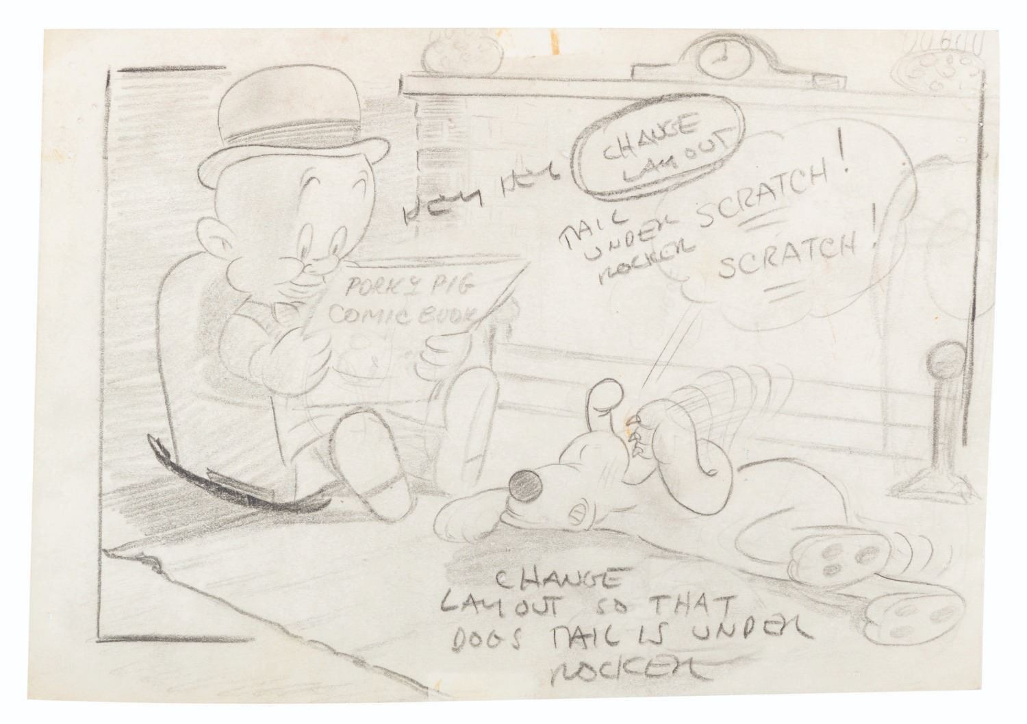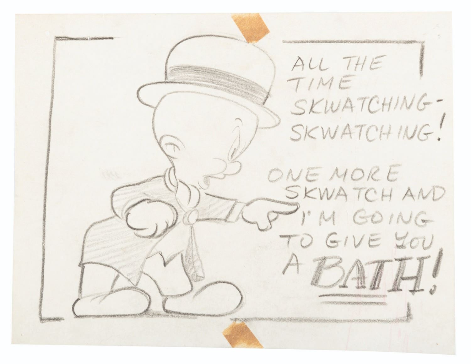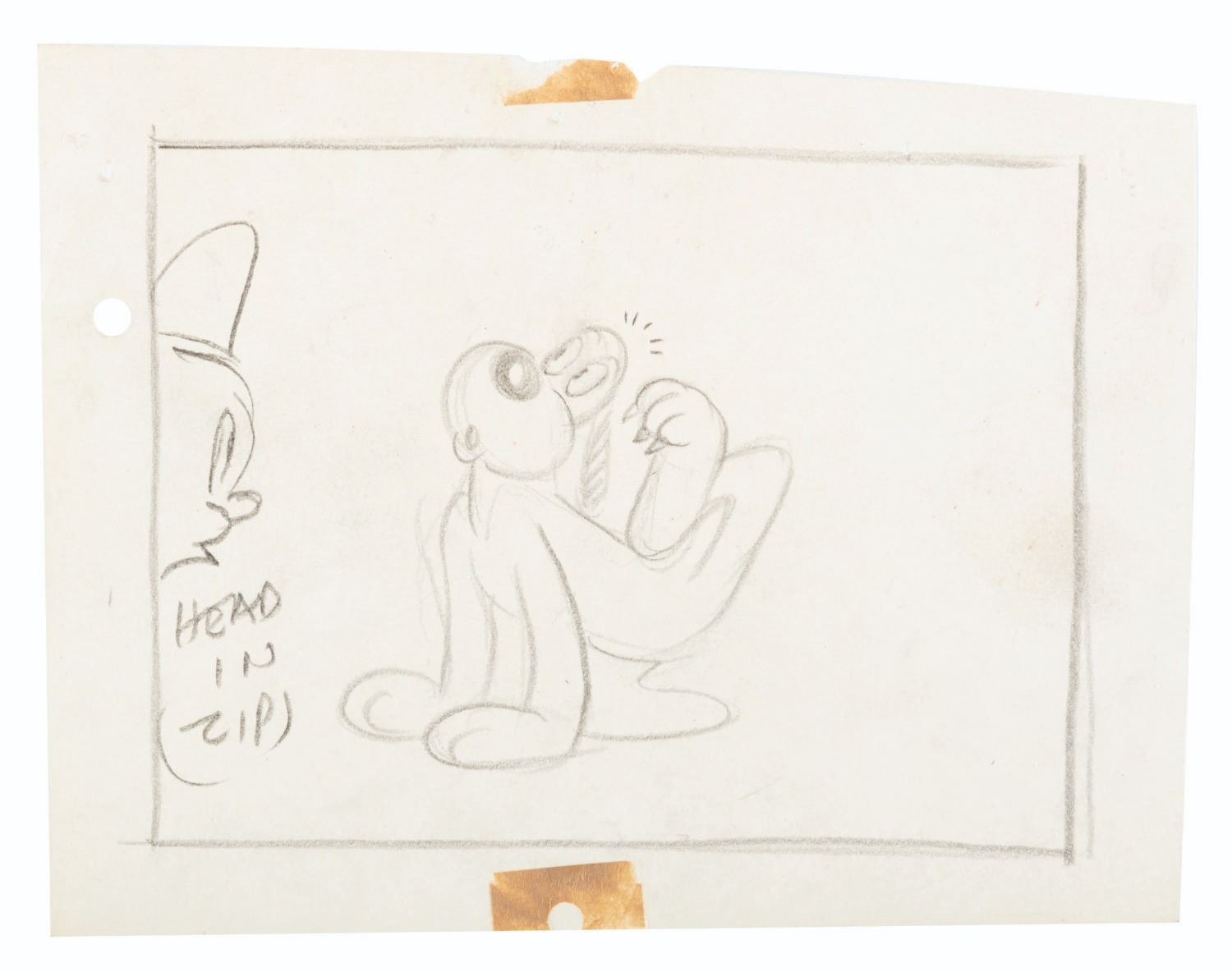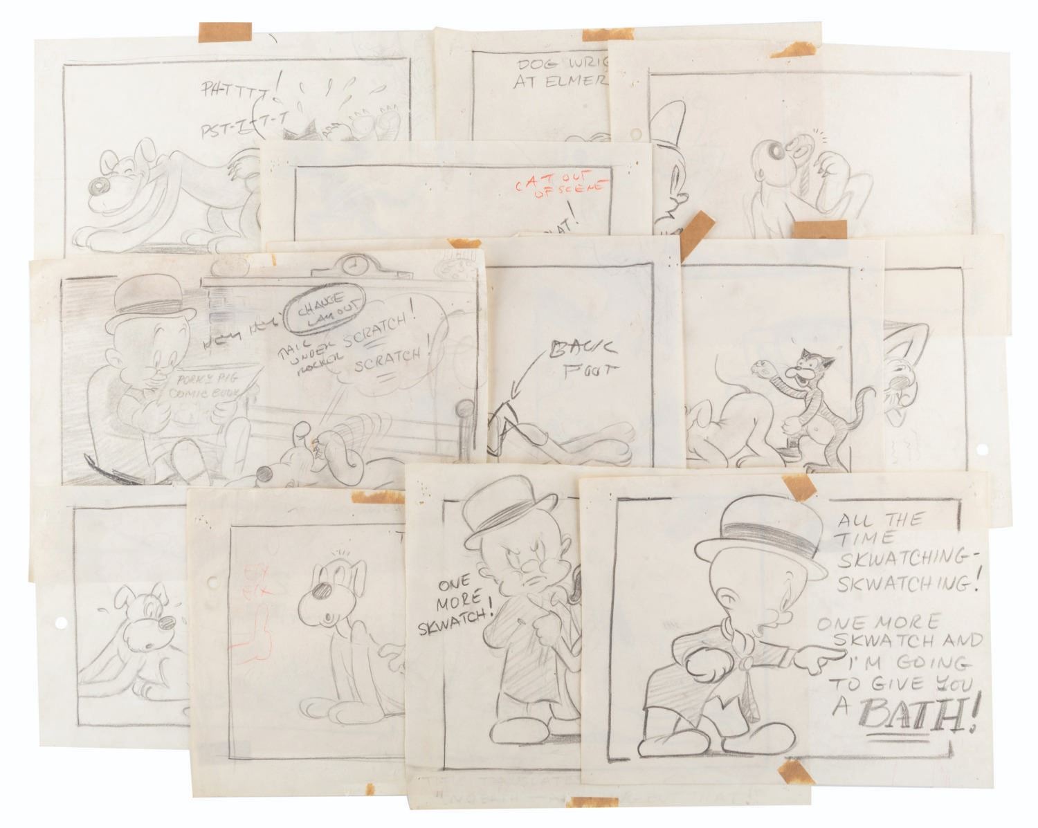 (Schlesinger, 1943) A collection of 12 storyboard panels from the Merrie Melodies short “An Itch in Time,” directed by Bob Clampett. Accomplished in graphite and colored pencil and ranging in size from 5” x 7.5” to 6” x 7.75”, the panels are in good condition with edge wear, pinholes and light corner tears from production use, and light discoloration from age.