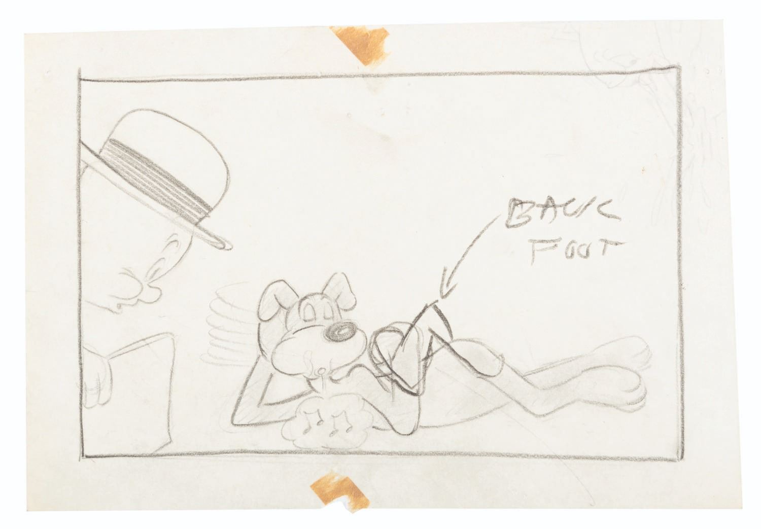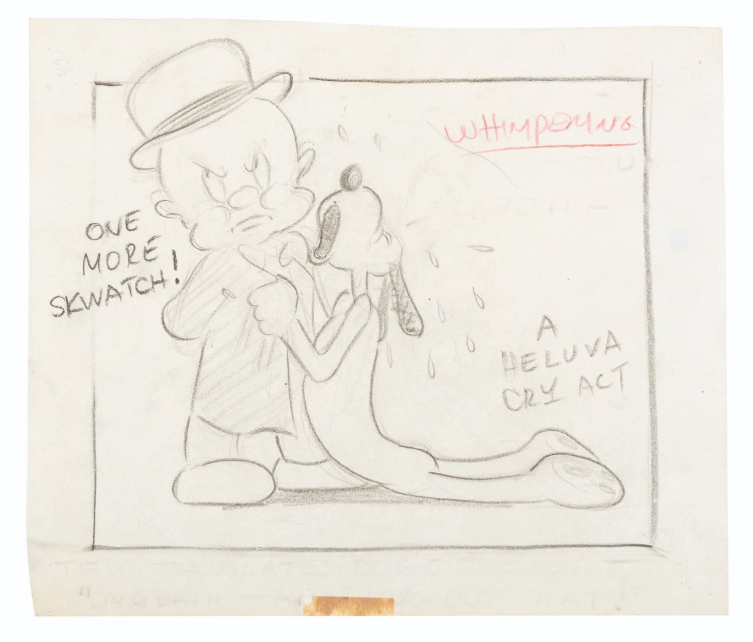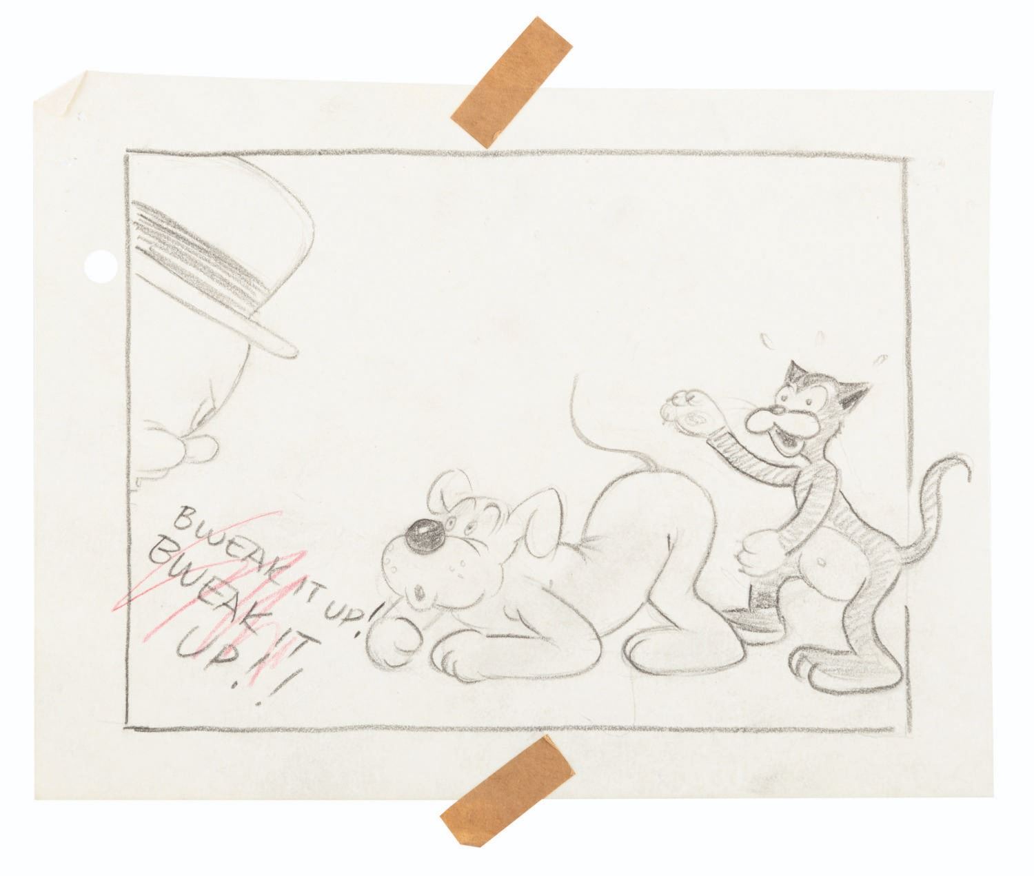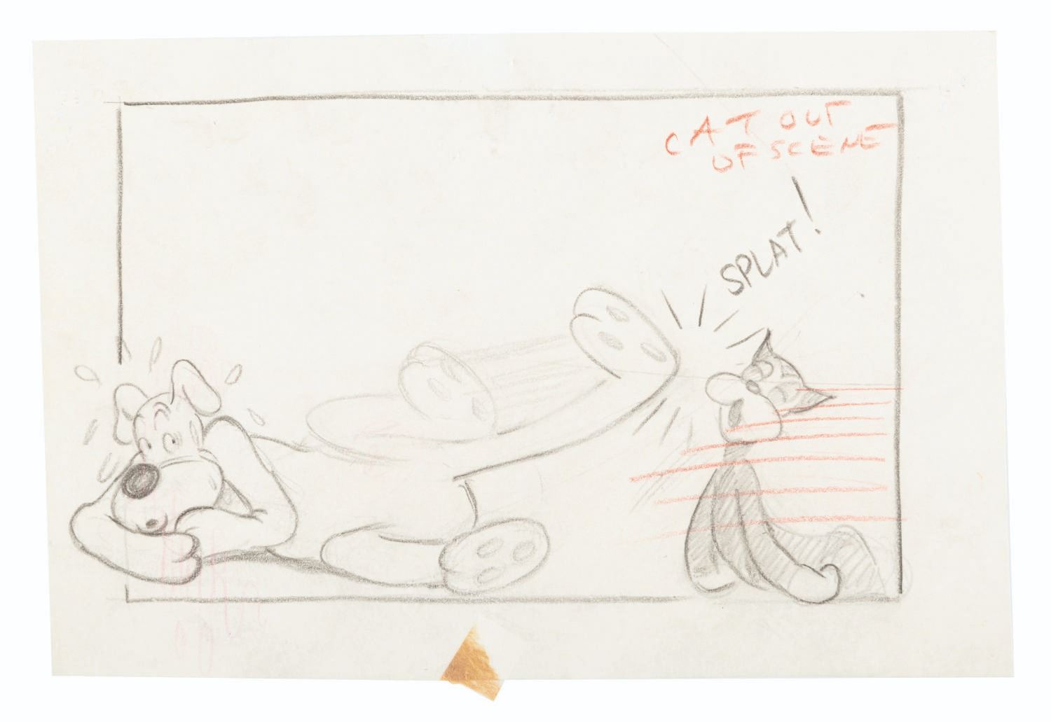 (Schlesinger, 1943) A collection of 12 storyboard panels from the Merrie Melodies short “An Itch in Time,” directed by Bob Clampett. Accomplished in graphite and colored pencil and ranging in size from 5” x 7.5” to 6” x 7.75”, the panels are in good condition with edge wear, pinholes and light corner tears from production use, and light discoloration from age.